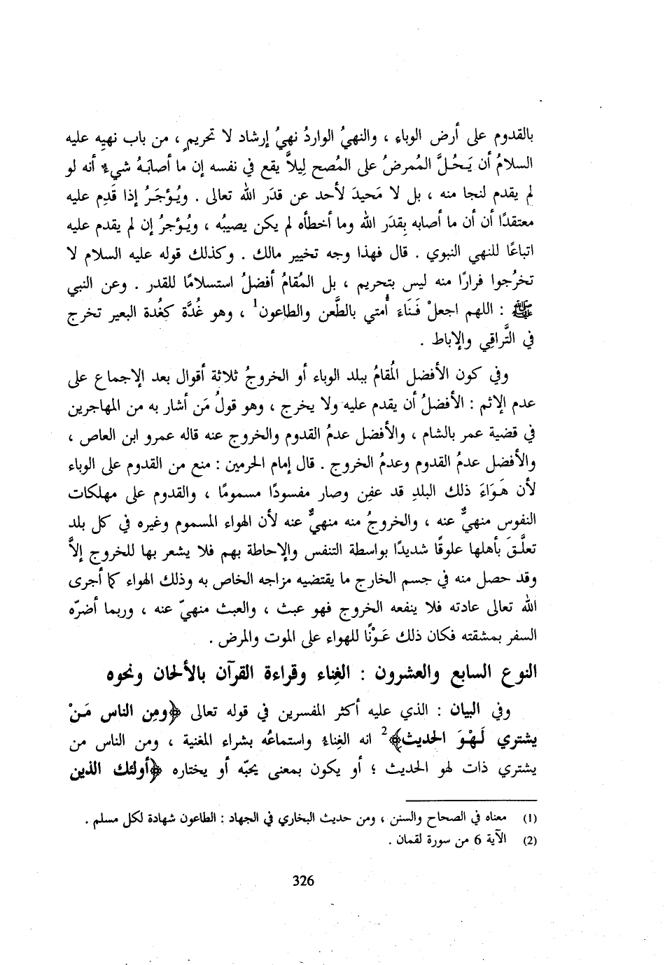بِالْقُدُومِ عَلَى أَرْضِ الْوَبَاءِ وَالنَّهْيُ الْوَارِدُ نَهْيُ إِرْشَادٍ لَا تَحْرِيمٍ مِنْ بَابِ نَهْيِهِ عَلَيْهِ السَّلَام أَن يحل الممرض على المصح لَيْلًا يَقَعَ فِي نَفْسِهِ إِنْ مَا أَصَابَهُ شَيْءٌ أَنَّهُ لَوْ لَمْ يَقْدَمْ لَنَجَا مِنْهُ بَلْ لَا مَحِيدَ لِأَحَدٍ عَنْ قَدَرِ اللَّهِ تَعَالَى ويؤجر إِذا قدم عَلَيْهِ مُعْتَقدًا أَن أَنَّ مَا أَصَابَهُ بِقَدَرِ اللَّهِ وَمَا أَخْطَأَهُ لَمْ يَكُنْ يُصِيبُهُ وَيُؤْجَرُ إِنْ لَمْ يَقْدَمْ عَلَيْهِ اتِّبَاعًا لِلنَّهْيِ النَّبَوِيِّ قَالَ فَهَذَا وَجْهُ تَخْيِير مَالك وَكَذَلِكَ قَوْله - صَلَّى اللَّهُ عَلَيْهِ وَسَلَّم َ - لَا تَخْرُجُوا فِرَارًا مِنْهُ لَيْسَ بِتَحْرِيمٍ بَلِ الْمُقَامُ أَفْضَلُ اسْتِسْلَامًا لِلْقَدَرِ وَعَنِ النَّبِيِّ - صَلَّى اللَّهُ عَلَيْهِ وَسَلَّم َ -