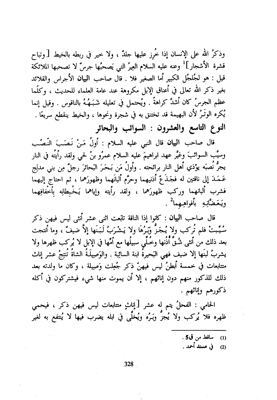 (أَوَّلُ مَنْ نَصَبَ النُّصُبَ وَسَيَّبَ السَّوَائِبَ وَغَيَّرَ عَهْدَ إِبْرَاهِيمَ عَلَيْهِ السَّلَامُ عَمْرُو بْنُ لُحَيٍّ وَلَقَد رَأَيْته فِي النَّار يجر نَصبه يُؤْذِي أهل النَّار برائحته وَأَوَّلُ مَنْ بَحَرَ الْبَحَائِرَ رَجُلٌ مِنْ بَنِي مُدْلِج عمد إِلَى ناقتين لَهُ فجذع أذنيهما وَحَرَّمَ أَلْبَانَهُمَا وَظُهُورَهُمَا ثُمَّ احْتَاجَ إِلَيْهِمَا فَشَرِبَ أَلْبَانهَا وَركب ظهورهما وَلَقَد رَأَيْته وإياهما يخبطانه بأخفافهما ويعضانه بأفواههما) قَالَ صابح الْبَيَانِ كَانُوا إِذَا النَّاقَةُ تَابَعَتِ اثْنَيْ عَشَرَ أُنْثَى لَيْسَ فِيهِنَّ ذَكَرٌ سُيِّبَتْ فَلَمْ تُرْكَبْ وَلَا يُجَزُّ وَبَرُهَا وَلَا يَشْرَبُ لَبَنَهَا إِلَّا ضَيْفٌ وَمَا أَنْتَجَتْ بَعْدَ ذَلِكَ مِنْ أُنْثًى شُقَّ أُذُنُهَا وَخُلِّيَ سَبِيلُهَا مَعَ أُمِّهَا فِي الْإِبِلِ لَا يُرْكَبُ ظَهْرُهَا وَلَا يَشْرَبُ لَبَنَهَا إِلَّا ضَيْفٌ فَهِيَ الْبَحِيرَةُ ابْنَةُ السَّائِبَةِ وَالْوَصِيلَةُ الشَّاةُ تُنْتِجُ عَشْرَ إِنَاثٍ مُتَتَابِعَاتٍ فِي خَمْسَةِ أَبْطُنٍ لَيْسَ فِيهِنَّ ذَكَرٌ جُعِلَتْ وَصِيلَةً وَكَانَ مَا وَلَدَتْهُ بَعْدَ ذَلِكَ لِلذُّكُورِ مِنْهُمْ دُونَ إناثهم إِلَّا أَن يَمُوت مِنْهَا شَيْء فيشركون فِي أَكْلِهِ ذُكُورُهُمْ وَإِنَاثُهُمْ الْحَامِي الْفَحْلُ يَتِمُّ لَهُ عَشْرُ إِنَاثٍ مُتَتَابِعَاتٍ لَيْسَ فِيهِنَّ ذَكَرٌ فَيُحْمَى ظَهْرُهُ فَلَا يُرْكَبُ وَلَا يُجَزُّ وَبَرُهُ وَيُخَلَّى فِي إِبِلِهِ يَضْرِبُ فِيهَا لَا يُنْتَفَعُ بِهِ لغير