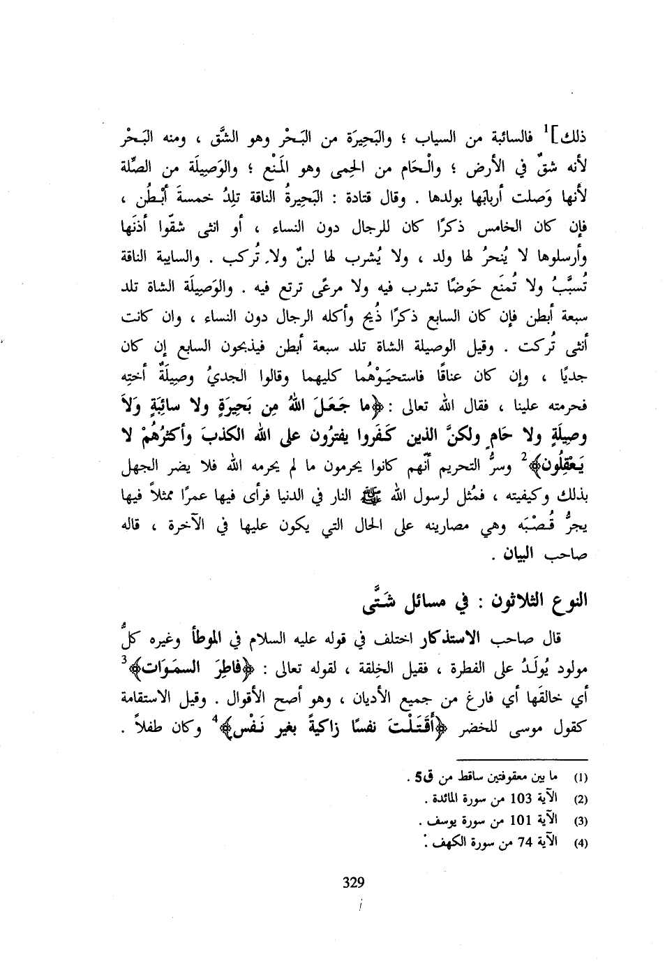 ذَلِكَ فَالسَّائِبَةُ مِنَ السَّيَابِ وَالْبَحِيرَةُ مِنَ الْبَحْرِ وَهُوَ الشَّقُّ وَمِنْهُ الْبَحْرُ لِأَنَّهُ شَقٌّ فِي الأَرْض والحام مِنَ الْحِمَى وَهُوَ الْمَنْعُ وَالْوَصِيلَةُ مِنَ الصِّلَةِ لِأَنَّهَا وَصَلَتْ أَرْبَابَهَا بِوَلَدِهَا وَقَالَ قَتَادَةُ الْبَحِيرَةُ النَّاقَةُ تَلِدُ خَمْسَةَ أَبْطُنٍ فَإِنْ كَانَ الْخَامِسُ ذكرا كَانَ للرِّجَال دون النِّسَاء أَو اثنى شَقُّوا أُذُنَهَا وَأَرْسَلُوهَا لَا يُنْحَرُ لَهَا وَلَدٌ وَلَا يشرب لَهَا لبن وَلَا تركب والسايبة النَّاقة تسبب وَلَا تُمْنَعُ حَوْضًا تَشْرَبُ فِيهِ وَلَا مَرْعًى تَرْتَعُ فِيهِ وَالْوَصِيلَةُ الشَّاةُ تَلِدُ سَبْعَةَ أَبْطُنٍ فَإِن كَانَ السَّابِع ذكرا ذيح وَأَكَلَهُ الرِّجَالُ دُونَ النِّسَاءِ وَإِنْ كَانَتْ أُنْثَى تُرِكَتْ وَقِيلَ الْوَصِيلَةُ الشَّاةُ تَلِدُ سَبْعَةَ أَبْطُنٍ فَيَذْبَحُونَ السَّابِعَ إِنْ كَانَ جَدْيًا وَإِنْ كَانَ عنَاقًا فاستحويهما كِلَيْهِمَا وَقَالُوا الْجَدْيُ وَصِيلَةُ أُخْتِهِ فَحَرَّمَتْهُ عَلَيْنَا فَقَالَ اللَّهُ تَعَالَى {مَا جَعَلَ اللَّهُ مِنْ بَحِيرَةٍ وَلا سَائِبَةٍ وَلا وَصِيلَةٍ وَلا حَامٍ وَلَكِنَّ الَّذِينَ كَفَرُوا يَفْتَرُونَ عَلَى اللَّهِ الْكَذِبَ وَأَكْثَرهم لَا يعْقلُونَ} وَسِرُّ التَّحْرِيمِ أَنَّهُمْ كَانُوا يُحَرِّمُونَ مَا لَمْ يُحَرِّمْهُ اللَّهُ فَلَا يَضُرُّ الْجَهْلُ بِذَلِكَ وَكَيْفِيَّتِهِ فَمُثِّلَ لِرَسُولِ اللَّهِ - صَلَّى اللَّهُ عَلَيْهِ وَسَلَّم َ - النَّارُ فِي الدُّنْيَا فَرَأَى فِيهَا عَمْرًا مُمَثَّلًا فِيهَا يَجُرُّ قَصَبَهُ وَهِيَ مَصَارِينُهُ عَلَى الْحَالِ الَّتِي يَكُونُ عَلَيْهَا فِي الْآخِرَةِ قَالَهُ صَاحِبُ الْبَيَانِ
