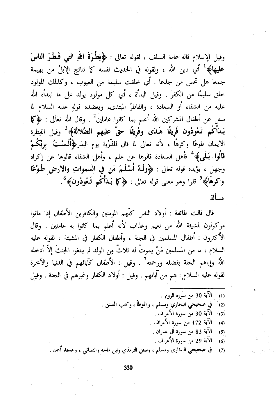 (لَمَّا سُئِلَ عَنْ أَطْفَالِ الْمُشْرِكِينَ اللَّهُ أَعْلَمُ بِمَا كَانُوا عَامِلِينَ) وَقَالَ اللَّهُ تَعَالَى {كَمَا بَدَأَكُمْ تعودُونَ فريقا هدى وفريقا حق عَلَيْهِم الضَّلَالَة} وَقِيلَ الْفِطْرَةُ الْإِيمَانُ طَوْعًا وَكَرْهًا لِأَنَّهُ تَعَالَى لَمَّا قَالَ لِلذُّرِّيَّةِ يَوْمَ الْبَذْرِ {أَلَسْتُ بِرَبِّكُمْ قَالُوا بلَى} فَأَهْلُ السَّعَادَةِ قَالُوهَا عَنْ عِلْمٍ وَأَهْلُ الشَّقَاءِ قَالُوهَا عَنْ إِكْرَاهٍ وَجَهْلٍ يُؤَيِّدُهُ قَوْله تَعَالَى {وَلَهُ أَسْلَمَ مَنْ فِي السَّمَاوَاتِ وَالأَرْضِ طَوْعًا وَكرها} قَالُوا وَهُوَ مَعْنَى قَوْله تَعَالَى {كَمَا بَدَأَكُمْ تعودُونَ}