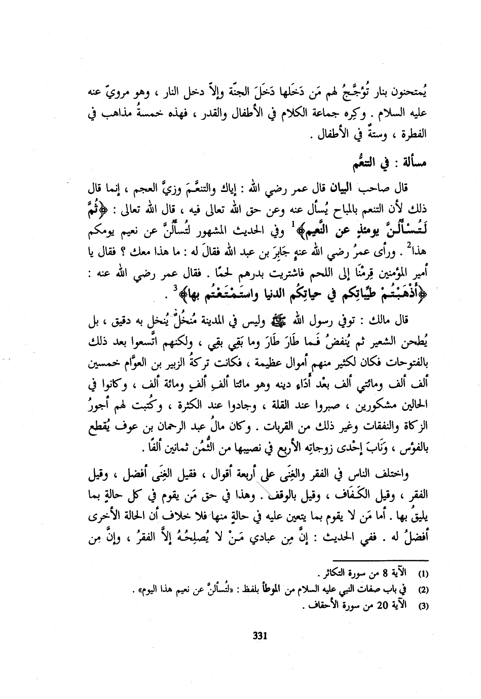 قَالَ صَاحِبُ الْبَيَانِ قَالَ عمر رَضِي الله عَنهُ إِيَّاكَ وَالتَّنَعُّمَ وَزِيَّ الْعَجَمِ إِنَّمَا قَالَ ذَلِكَ لِأَنَّ التَّنَعُّمَ بِالْمُبَاحِ يُسْأَلُ عَنْهُ وَعَنْ حَقِّ اللَّهِ تَعَالَى فِيهِ قَالَ اللَّهُ تَعَالَى {ثُمَّ لتسألن يَوْمئِذٍ عَن النَّعيم} وَفِي الْحَدِيثِ الْمَشْهُورِ لَتُسْأَلُنَّ عَنْ نَعِيمِ يَوْمِكُمْ هَذَا وَرَأَى عُمَرُ رَضِيَ اللَّهُ عَنْهُ جَابِرَ بْنَ عَبْدِ اللَّهِ فَقَالَ لَهُ مَا هَذَا مَعَكَ فَقَالَ يَا أَمِيرَ الْمُؤْمِنِينَ قَرِمْنَا إِلَى اللَّحْمِ فَاشْتَرَيْتُ بِدِرْهَمٍ لَحْمًا فَقَالَ عُمَرُ رَضِيَ الله عته {أَذْهَبْتُمْ طَيِّبَاتِكُمْ فِي حَيَاتِكُمُ الدُّنْيَا وَاسْتَمْتَعْتُمْ بِهَا} قَالَ مَالِكٌ تُوُفِّيَ رَسُولُ اللَّهِ - صَلَّى اللَّهُ عَلَيْهِ وَسَلَّم َ - وَلَيْسَ فِي الْمَدِينَةِ مُنْخُلٌ يُنْخَلُ بِهِ دَقِيقٌ بَلْ يُطْحَنُ الشَّعِيرُ ثُمَّ يُنْفَضُ فَمَا طَارَ طَارَ وَمَا بَقِيَ بَقِيَ وَلَكِنَّهُمُ اتَّسَعُوا بَعْدَ ذَلِكَ بِالْفُتُوحَاتِ فَكَانَ لِكَثِيرٍ مِنْهُمْ أَمْوَالٌ عَظِيمَةٌ فَكَانَتْ تَرِكَةُ الزُّبَيْرِ بْنِ الْعَوَّامِ خَمْسِينَ أَلْفَ أَلْفٍ وَمِائَتَيْ أَلْفٍ بَعْدَ أَدَاءِ دَيْنِهِ وَهُوَ مِائَتَا أَلْفِ أَلْفٍ وَمِائَةُ أَلْفٍ وَكَانُوا فِي الْحَالَيْنِ مَشْكُورِينَ صَبَرُوا عِنْدَ الْقِلَّةِ وَجَادُوا عِنْدَ الْكَثْرَةِ وَكُتِبَتْ لَهُمْ أُجُورُ الزَّكَاةِ وَالنَّفَقَاتِ وَغَيْرِ ذَلِكَ مِنَ الْقُرُبَاتِ وَكَانَ مَالُ عَبْدِ الرَّحْمَنِ بن عَوْف يقطع بالفؤس وَنَابَ إِحْدَى زَوْجَاتِهِ الْأَرْبَعِ فِي نَصِيبِهَا مِنَ الثّمن ثَمَانِينَ أَلْفًا وَاخْتَلَفَ النَّاسُ فِي الْفَقْرِ وَالْغِنَى عَلَى أَرْبَعِةِ أَقْوَالٍ فَقِيلَ الْغِنَى أَفْضَلُ وَقِيلَ الْفَقْرُ وَقيل الكفاف وَقيل الْوَقْف وَهَذَا فِي حَقِّ مَنْ يَقُومُ فِي كُلِّ حَالَةٍ بِمَا يَلِيقُ بِهَا أَمَّا مَنْ لَا يَقُومُ بِمَا يَتَعَيَّنُ عَلَيْهِ فِي حَالَةٍ مِنْهَا فَلَا خِلَافَ أَنَّ الْحَالَةَ الْأُخْرَى أَفْضَلُ لَهُ فَفِي الْحَدِيثِ