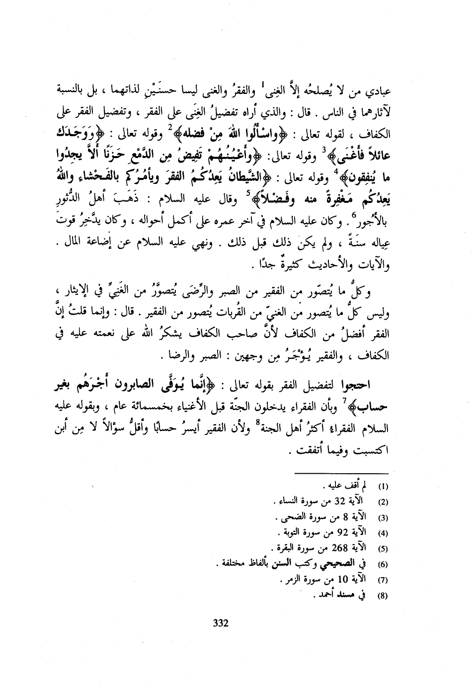 عِبَادِي مَنْ لَا يُصْلِحُهُ إِلَّا الْغِنَى) وَالْفَقْرُ وَالْغِنَى لَيْسَا حَسَنَيْنِ لِذَاتِهِمَا بَلْ بِالنِّسْبَةِ لِآثَارِهِمَا فِي النَّاسِ قَالَ وَالَّذِي أَرَاهُ تَفْضِيلَ الْغِنَى عَلَى الْفَقْرِ وَتَفْضِيلَ الْفَقْرِ عَلَى الْكَفَافِ لِقَوْلِهِ تَعَالَى {واسألوا الله من فَضله} وَقَوله تَعَالَى {ووجدك عائلا فأغنى} وقَوْله تَعَالَى {وَأَعْيُنُهُمْ تَفِيضُ مِنَ الدَّمْعِ حَزَنًا أَلا يَجدوا مَا يُنْفقُونَ} وقَوْله تَعَالَى {الشَّيْطَانُ يَعِدُكُمُ الْفَقْرَ وَيَأْمُرُكُمْ بِالْفَحْشَاءِ وَالله يَعدكُم مغْفرَة مِنْهُ وفضلا} وَقَالَ - صَلَّى اللَّهُ عَلَيْهِ وَسَلَّم َ -: