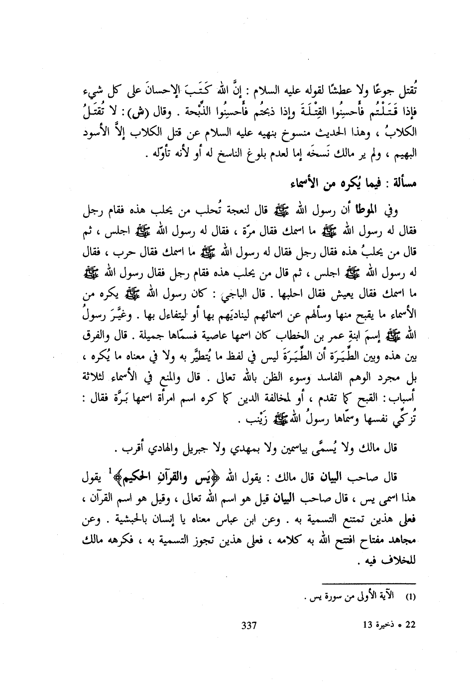 وَفِي الْمُوَطَّأِ أَنَّ رَسُولَ اللَّهِ - صَلَّى اللَّهُ عَلَيْهِ وَسَلَّم َ - قَالَ لِنَعْجَةٍ تُحْلَبُ مَنْ يَحْلُبُ هَذِهِ فَقَامَ رَجُلٌ فَقَالَ لَهُ رَسُولُ اللَّهِ - صَلَّى اللَّهُ عَلَيْهِ وَسَلَّم َ - مَا اسْمُكَ فَقَالَ مُرَّةُ فَقَالَ لَهُ رَسُولُ اللَّهِ - صَلَّى اللَّهُ عَلَيْهِ وَسَلَّم َ - اجْلِسْ ثمَّ قَالَ من يحلب هَذِه فَقَالَ رَجُلٌ فَقَالَ لَهُ رَسُولُ اللَّهِ - صَلَّى اللَّهُ عَلَيْهِ وَسَلَّم َ - مَا اسْمُكَ فَقَالَ حَرْبٌ فَقَالَ لَهُ رَسُولُ اللَّهِ - صَلَّى اللَّهُ عَلَيْهِ وَسَلَّم َ - اجْلِسْ ثُمَّ قَالَ مَنْ يَحْلُبُ هَذِهِ فَقَامَ رَجُلٌ فَقَالَ رَسُولُ اللَّهِ - صَلَّى اللَّهُ عَلَيْهِ وَسَلَّم َ - مَا اسْمُكَ فَقَالَ يَعِيشُ فَقَالَ احْلُبْهَا قَالَ الْبَاجِيُّ كَانَ رَسُولُ اللَّهِ - صَلَّى اللَّهُ عَلَيْهِ وَسَلَّم َ - يَكْرَهُ مِنَ الْأَسْمَاءِ مَا يَقْبُحُ مِنْهَا وَسَأَلَهُمْ عَنْ أَسْمَائِهِمْ لِيُنَادِيَهُمْ بِهَا أَوْ لِيَتَفَاءَلَ بِهَا وَغَيَّرَ رَسُولُ اللَّهِ - صَلَّى اللَّهُ عَلَيْهِ وَسَلَّم َ - اسْمَ ابْنَةِ عُمَرَ بْنِ الْخَطَّابِ كَانَ اسْمُهَا عَاصِيَةَ فَسَمَّاهَا جَمِيلَةَ قَالَ وَالْفَرْقُ بَيْنَ هَذِهِ وَبَيْنَ الطِّيَرَةِ أَنَّ الطِّيَرَةَ لَيْسَ فِي لَفْظِ مَا يُتَطَيَّرُ بِهِ وَلَا فِي مَعْنَاهُ مَا يُكْرَهُ بَلْ مُجَرَّدُ الْوَهْمِ الْفَاسِدِ وَسُوءِ الظَّنِّ بِاللَّهِ تَعَالَى قَالَ وَالْمَنْعُ فِي الْأَسْمَاءِ لِثَلَاثَةِ أَسْبَابٍ الْقُبْحُ كَمَا تَقَدَّمَ أَوْ لِمُخَالَفَةِ الدِّينِ كَمَا كَرِهَ اسْمَ امْرَأَةٍ اسْمُهَا بَرَّةُ فَقَالَ تُزَكِّي نَفْسَهَا وَسَمَّاهَا رَسُولُ اللَّهِ - صَلَّى اللَّهُ عَلَيْهِ وَسَلَّم َ - زَيْنَب قَالَ مَالك وَلَا يُسمى بياسمين وَلَا بِمَهْدِيٍّ وَلَا جِبْرِيلَ وَالْهَادِي أَقْرَبُ قَالَ صَاحِبُ الْبَيَانِ قَالَ مَالِكٌ يَقُولُ اللَّهُ {يس وَالْقُرْآن الْحَكِيم} يَقُولُ هَذَا اسْمِي يس قَالَ صَاحِبُ الْبَيَانِ قِيلَ هُوَ اسْمُ اللَّهِ تَعَالَى وَقِيلَ هُوَ اسْمُ الْقُرْآنِ فَعَلَى هَذَيْنِ تَمْتَنِعُ التَّسْمِيَةُ بِهِ وَعَنِ ابْنِ عَبَّاسٍ مَعْنَاهُ يَا إِنْسَانُ بِالْحَبَشِيَّةِ وَعَنْ مُجَاهِدٍ مِفْتَاحٌ افْتَتَحَ اللَّهُ بِهِ كَلَامَهُ فَعَلَى هَذَيْنِ تَجُوزُ التَّسْمِيَةُ بِهِ فَكَرِهَهُ مَالِكٌ للْخلاف فِيهِ