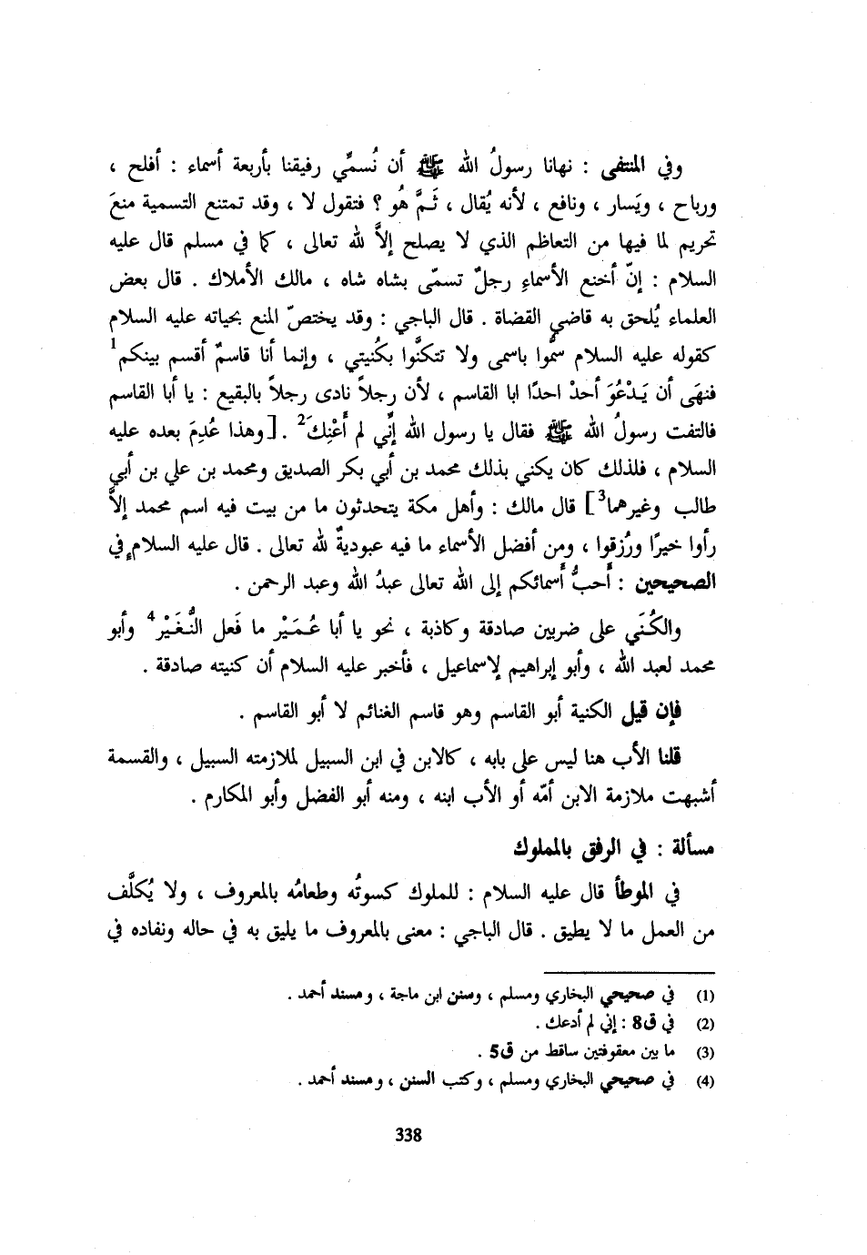 وَفِي المنتفى نَهَانَا رَسُولُ اللَّهِ - صَلَّى اللَّهُ عَلَيْهِ وَسَلَّم َ - أَن نسمي رفيقنا بِأَرْبَعَةِ أَسْمَاءٍ أَفْلَحَ وَرَبَاحٍ وَيَسَارٍ وَنَافِعٍ لِأَنَّهُ يُقَالُ ثَمَّ هُوَ فَتَقُولُ لَا وَقَدْ تَمْتَنِعُ التَّسْمِيَةُ مَنْعَ تَحْرِيمٍ لِمَا فِيهَا مِنَ التَّعَاظُمِ الَّذِي لَا يَصْلُحُ إِلَّا لِلَّهِ تَعَالَى كَمَا فِي مُسْلِمٍ قَالَ - صَلَّى اللَّهُ عَلَيْهِ وَسَلَّم َ - إِنَّ أَخْنَعَ الْأَسْمَاءِ رَجُلٌ تَسَمَّى بِشَاهٍ شَاهْ مَالِكِ الْأَمْلَاكِ قَالَ بَعْضُ الْعُلَمَاءِ يَلْحَقُ بِهِ قَاضِي الْقُضَاةِ قَالَ الْبَاجِيُّ وَقَدْ يَخْتَصُّ الْمَنْعُ بحياته - صَلَّى اللَّهُ عَلَيْهِ وَسَلَّم َ - كَقَوْلِه - صَلَّى اللَّهُ عَلَيْهِ وَسَلَّم َ -