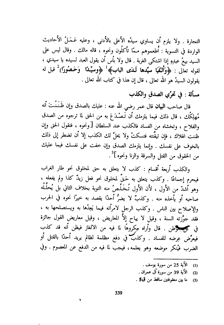 قَالَ صَاحِبُ الْبَيَانِ قَالَ عُمَرُ رَضِيَ اللَّهُ عَنْهُ عَلَيْكَ بِالصِّدْقِ وَإِنْ ظَنَنْتَ أَنَّهُ مُهْلِكُكَ قَالَ ذَلِكَ فِيمَا يَلْزَمُكَ أَنْ تَصْدَعَ بِهِ مِنَ الْحَقِّ لما ترجوه من الصدْق والفلاح وتحشاه مِنَ الْفَسَادِ فَالْكَذِبُ عِنْدَ السُّلْطَانِ وَنَحْوِهِ فَتَقُولُ الْحَقَّ وَإِنْ ظَنَنْتَ الْهَلَاكَ فَإِنْ تَيَقَّنْتَهُ فَتَسْكُتُ وَلَا يَحِلُّ لَكَ الْكَذِبُ إِلَّا أَنْ تُضْطَّرَ إِلَى ذَلِكَ بِالْخَوْفِ عَلَى نَفْسِكَ وَإِنَّمَا يَلْزَمُكَ الصدْق وَإِن خِفْتَ عَلَى نَفْسِكَ فِيمَا عَلَيْكَ مِنَ الْحُقُوقِ مِنَ الْقَتْلِ وَالسَّرِقَةِ وَالزِّنَا وَنَحْوِهِ وَالْكَذِبُ أَرْبَعَةُ أَقْسَامٍ كَذِبٌ لَا يَتَعَلَّقُ بِهِ حَقٌّ لِمَخْلُوقٍ نَحْوُ طَارَ الْغُرَابُ فَيَحْرُمُ إِجْمَاعًا وَكَذِبٌ يَتَعَلَّقُ بِهِ حَقٌّ لِمَخْلُوقٍ نَحْوُ فَعَلَ زَيْدٌ كَذَا وَلَمْ يَفْعَلْهُ وَهُوَ أَشَدُّ مِنَ الْأَوَّلِ لِأَنَّ الْأَوَّلَ تُخَلِّصُ مِنْهُ التَّوْبَةُ بِخِلَافِ الثَّانِي بَلْ يُحَلِّلُهُ صَاحِبُهُ أَوْ يَأْخُذُهُ مِنْهُ وَكَذِبٌ لَا يَضُرُّ أَحَدًا يَقْصِدُ بِهِ خَيْرًا نَحْوُهُ فِي الْحَرْبِ وَالْإِصْلَاحِ بَيْنَ النَّاسِ وَكَذِبُ الرَّجُلِ لِامْرَأَتِهِ فِيمَا يَعِدُهَا بِهِ وَيَسْتَصْلِحُهَا بِهِ فَقَدَ جَوَّزَتْهُ السُّنَّةُ وَقِيلَ لَا يُبَاحُ إِلَّا الْمَعَارِيضُ وَقِيلَ مَعَارِيضُ الْقَوْلِ جَائِزَةٌ فِي كُلِّ مَوْطِنٍ قَالَ وَأَرَاهُ مَكْرُوهًا لِمَا فِيهِ مِنَ الْإِلْغَازِ فَيُظَنُّ أَنَّهُ قَدْ كَذَبَ فَيُعَرِّضُ عِرْضَهُ لِلْفَسَادِ وَكَذِبٌ فِي دَفْعِ مَظْلَمَةٍ لِظَالِمٍ يُرِيدُ أَحَدًا بِالْقَتْلِ أَوِ الضَّرْبِ فَيُنْكِرُ مَوْضِعَهُ وَهُوَ يَعْلَمُهُ فَيَجِبُ لِمَا فِيهِ مِنَ الدَّفْعِ عَنِ الْمَعْصُومِ وَفِي