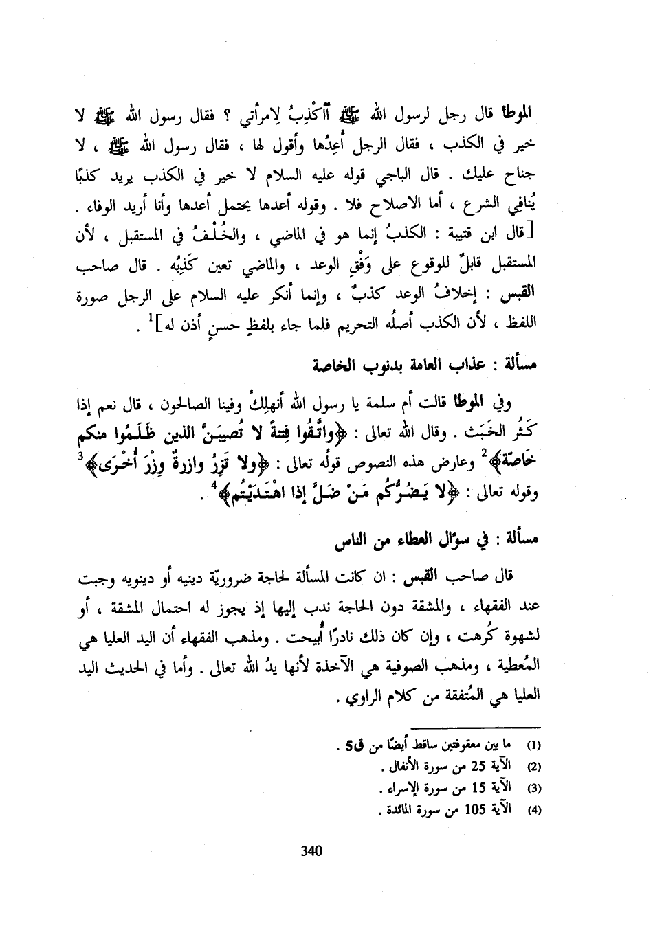 الْمُوَطَّأِ قَالَ رَجُلٌ لِرَسُولِ اللَّهِ - صَلَّى اللَّهُ عَلَيْهِ وَسَلَّم َ - أَأَكْذِبُ لِامْرَأَتِي فَقَالَ رَسُولُ اللَّهِ - صَلَّى اللَّهُ عَلَيْهِ وَسَلَّم َ - لَا خَيْرَ فِي الْكَذِبِ فَقَالَ الرَّجُلُ أَعِدُهَا وَأَقُولُ لَهَا فَقَالَ رَسُولُ اللَّهِ - صَلَّى اللَّهُ عَلَيْهِ وَسَلَّم َ - لَا جنَاح عَلَيْك قَالَ الْبَاجِيّ قَوْله - صَلَّى اللَّهُ عَلَيْهِ وَسَلَّم َ - لَا خَيْرَ فِي الْكَذِبِ يُرِيدُ كَذِبًا يُنَافِي الشَّرْعَ أَمَّا الْإِصْلَاحُ فَلَا وَقَوْلُهُ أَعِدُهَا يَحْتَمِلُ أَعِدُهَا وَأَنَا أُرِيدُ الْوَفَاءَ قَالَ ابْنُ قُتَيْبَةَ الْكَذِبُ إِنَّمَا هُوَ فِي الْمَاضِي وَالْخُلْفُ فِي الْمُسْتَقْبَلِ لِأَنَّ الْمُسْتَقْبَلَ قَابِلٌ لِلْوُقُوعِ عَلَى وَفْقِ الْوَعْدِ وَالْمَاضِي تَعَيَّنَ كَذِبُهُ قَالَ صَاحِبُ الْقَبَسِ إخلاف الْوَعْد كذب وَإِنَّمَا أنكر - صَلَّى اللَّهُ عَلَيْهِ وَسَلَّم َ - عَلَى الرَّجُلِ صُورَةَ اللَّفْظِ لِأَنَّ الْكَذِبَ أَصْلُهُ التَّحْرِيمُ فَلَمَّا جَاءَ بِلَفْظٍ حَسَنٍ أَذِنَ لَهُ