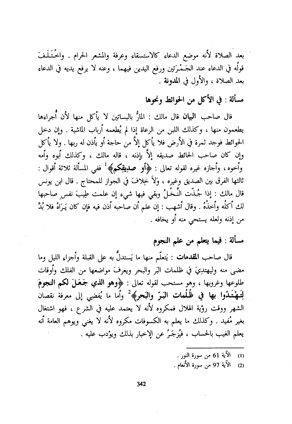 قَالَ صَاحِبُ الْمُقَدِّمَاتِ يَتَعَلَّمُ مِنْهَا مَا يَسْتَدِلُّ بِهِ عَلَى الْقِبْلَةِ وَأَجْزَاءِ اللَّيْلِ وَمَا مَضَى مِنْهُ وَلِيَهْتَدِيَ فِي ظُلُمَاتِ الْبَرِّ وَالْبَحْرِ وَيَعْرِفَ مَوَاضِعَهَا مِنَ الْفَلَكِ وَأَوْقَاتِ طُلُوعِهَا وَغُرُوبِهَا وَهُوَ مُسْتَحَبٌّ لِقَوْلِهِ تَعَالَى {وَهُوَ الَّذِي جَعَلَ لَكُمُ النُّجُومَ لِتَهْتَدُوا بِهَا فِي ظلمات الْبر وَالْبَحْر} وَأَمَّا مَا يُفْضِي إِلَى مَعْرِفَةِ نُقْصَانِ الشَّهْرِ وَوَقْتِ رُؤْيَةِ الْهِلَالِ فَمَكْرُوهٌ لِأَنَّهُ لَا يُعْتَمَدُ عَلَيْهِ فِي الشَّرْعِ فَهُوَ اشْتِغَالٌ بِغَيْرٍ مُفِيدٍ وَكَذَلِكَ مَا يَعْلَمُ بِهِ الْكُسُوفَاتِ مَكْرُوهٌ لِأَنَّهُ لَا يُغْنِي وَيُوهِمُ الْعَامَّةَ أَنَّهُ يَعْلَمُ الْغَيْبَ بِالْحِسَابِ فَيُزْجَرُ عَنِ الْإِخْبَارِ بِذَلِكَ وَيُؤَدَّبُ عَلَيْهِ