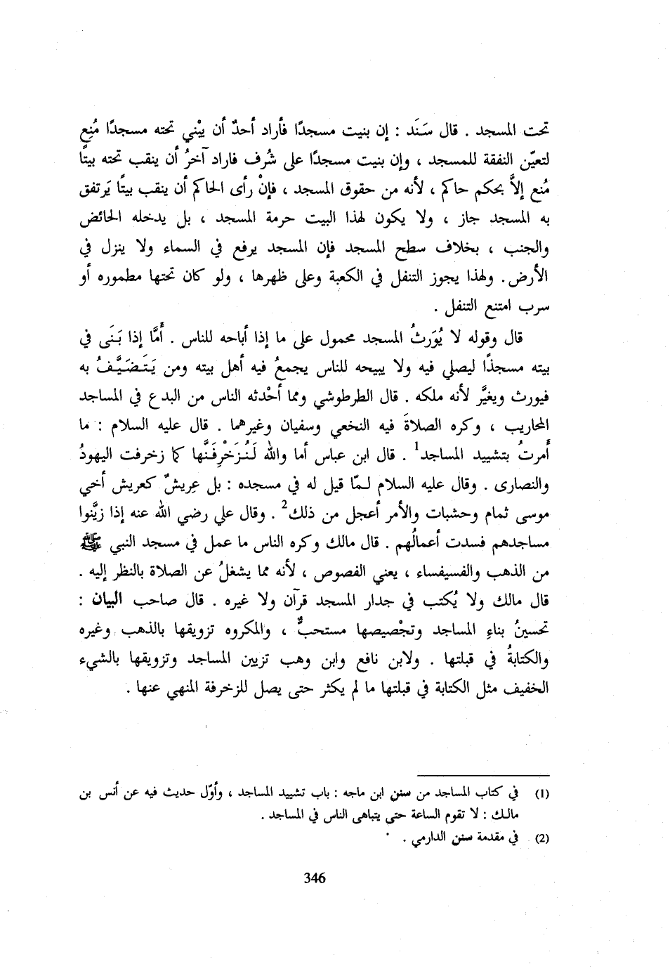 تَحْتَ الْمَسْجِدِ قَالَ سَنَدٌ إِنْ بَنَيْتَ مَسْجِدًا فَأَرَادَ أَحَدٌ أَنْ يَبْنِيَ تَحْتَهُ مَسْجِدًا مُنِعَ لِتَعَيُّنِ النَّفَقَةِ لِلْمَسْجِدِ وَإِنْ بَنَيْتَ مَسْجِدًا عَلَى شُرُفٍ فَأَرَادَ آخَرُ أَنْ يَنْقُبَ تَحْتَهُ بَيْتًا مُنِعَ إِلَّا بِحُكْمِ حَاكِمٍ لِأَنَّهُ مِنْ حُقُوقِ الْمَسْجِدِ فَإِنْ رَأَى الْحَاكِمُ أَنْ يَنْقُبَ بَيْتًا يَرْتَفِقُ بِهِ الْمَسْجِدُ جَازَ وَلَا يَكُونُ لِهَذَا الْبَيْتِ حُرْمَةُ الْمَسْجِدِ بَلْ يَدْخُلُهُ الْحَائِضُ وَالْجُنُبُ بِخِلَافِ سَطْحِ الْمَسْجِدِ فَإِنَّ الْمَسْجِدَ يُرْفَعُ فِي السَّمَاءِ وَلَا يَنْزِلُ فِي الْأَرْضِ وَلِهَذَا يَجُوزُ التَّنَفُّلُ فِي الْكَعْبَةِ وَعَلَى ظَهْرِهَا وَلَوْ كَانَ تَحْتَهَا مَطْمُورَةٌ أَوْ سَرَبٌ امْتَنَعَ التَّنَفُّلُ قَالَ وَقَوْلُهُ لَا يُورَثُ الْمَسْجِدُ مَحْمُولٌ عَلَى مَا إِذَا أَبَاحَهُ لِلنَّاسِ أَمَّا إِذَا بَنَى فِي بَيْتِهِ مَسْجِدًا لِيُصَلِّيَ فِيهِ وَلَا يُبِيحُهُ لِلنَّاسِ يَجْمَعُ فِيهِ أَهْلَ بَيْتِهِ وَمَنْ يَتَضَيَّفُ بِهِ فَيُورَثُ وَيُغَيَّرُ لِأَنَّهُ مِلْكُهُ قَالَ الطُّرْطُوشِيُّ وَمِمَّا أَحْدَثَهُ النَّاسُ مِنَ الْبِدَعِ فِي الْمَسَاجِدِ الْمَحَارِيبُ وَكَرِهَ الصَّلَاةَ فِيهِ النَّخَعِيُّ وَسُفْيَانُ وَغَيْرُهُمَا قَالَ - صَلَّى اللَّهُ عَلَيْهِ وَسَلَّم َ -