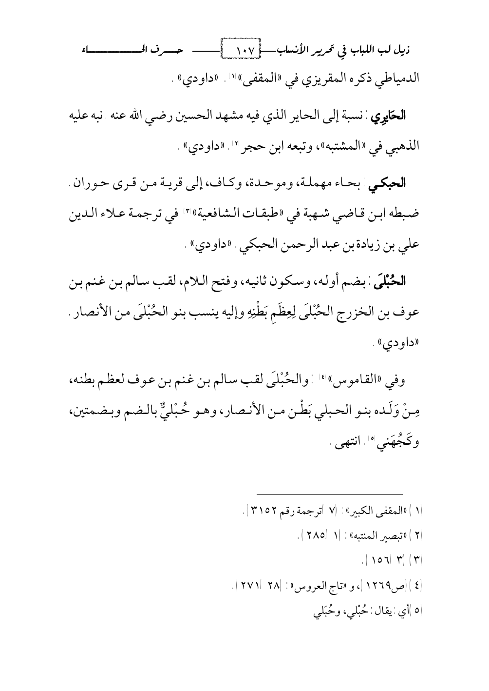 (¬1) عرف بهذه النسبة هبة الله بن محمد بن الحسن بن أحمد أبو القاسم بن أبي غالب الحبيبي، استدركه ابن الأثير في «اللباب»: (1/ 339) على أنساب السمعاني تحت نسبة الحبيبي، وفات السيوطي التنبيه عليه في «اللب»: (1/ 235).