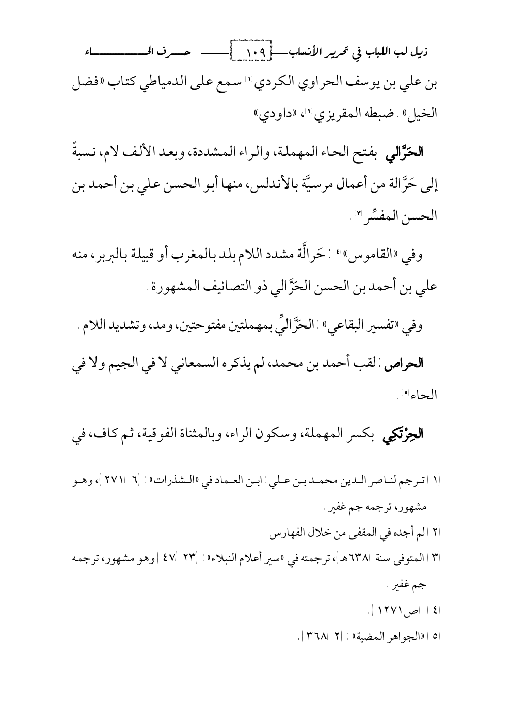 الحَزُّوري: بفتح المهملة، وتشديد الزاي المنقوطة، وضمها، وآخرها مهملة، إلى قرية بدمشق، ضبطها البقاعي في ترجمة أحمد بن محمد بن عبد الرحيم الحزوري المصري الشافعي (¬3). «داودي» (¬4).