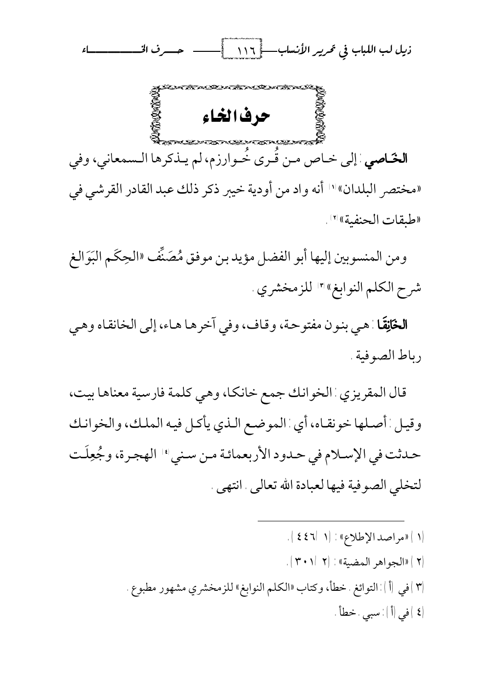 وفي «المراصد» (¬1): الخَانِقَة بعد الألف نون مكسورة وقاف تأنيث الخانق، وهو متعبد للكرامية (¬2) بالبيت المقدس. انتهى.