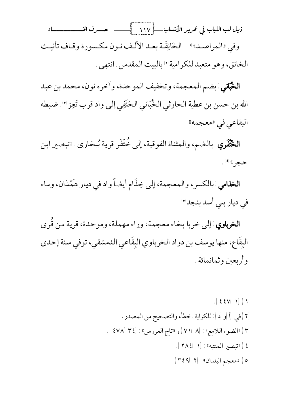 الخرفي (¬4): وخُرْفَة بخاء معجمة، فراء ساكنة، ثم فاء مفتوحة من قرى نصيبين. كذا ضبطه ابن السبكي (¬5) في ترجمة الإمام تقي الدين أحمد بن المبارك.