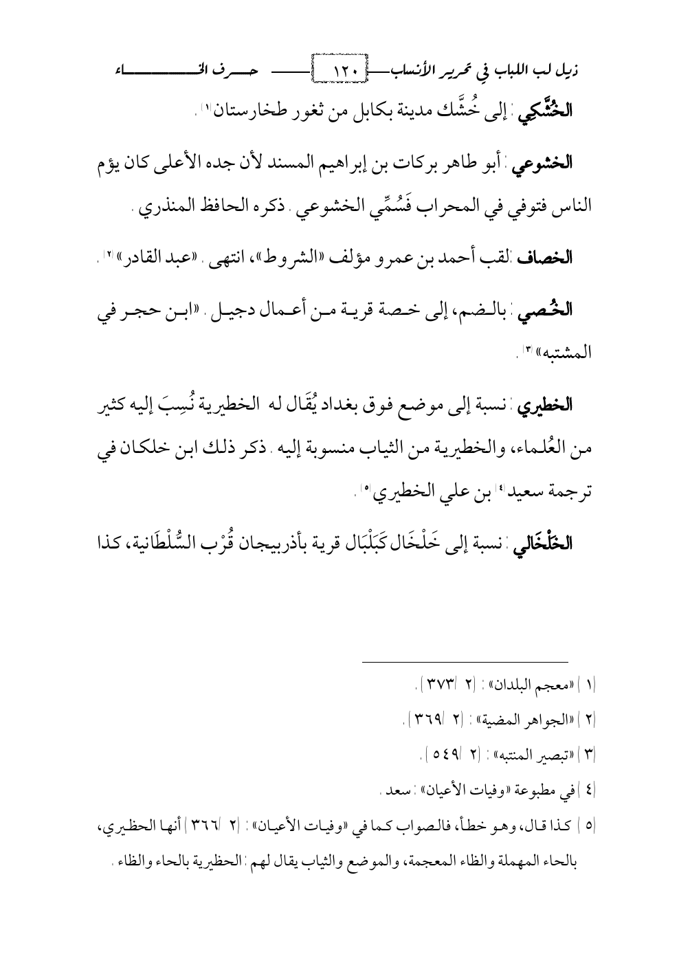 الخوارزمي: لم يضبطها السمعاني ولا ابن الأثير، وقد ضبطها في «مختصر البلدان» (¬5) فقال: بين الضمة والفتحة مُسْتَرَقة مُخْتَلَسة ليست بألف صحيحة كذا يتلفظون به. انتهى.