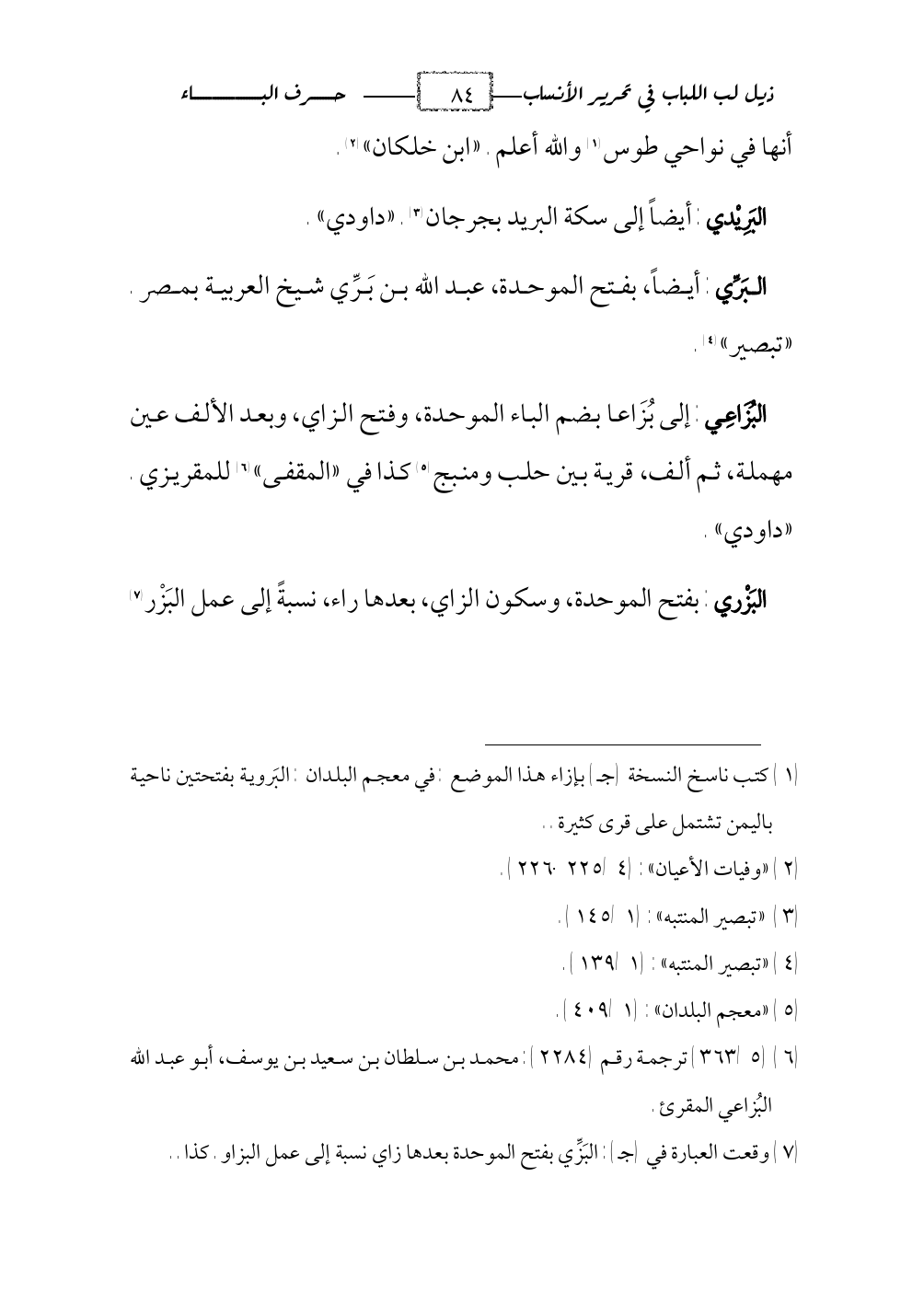 البَزُوري: إلى بَزُورا، قرية بدجيل من قرى بغداد، منها عبد الرحمن بن (¬5) عيسى الحنبلي البغدادي. كذا في «طبقات ابن رجب» (¬6)، انتهى. «داودي».
