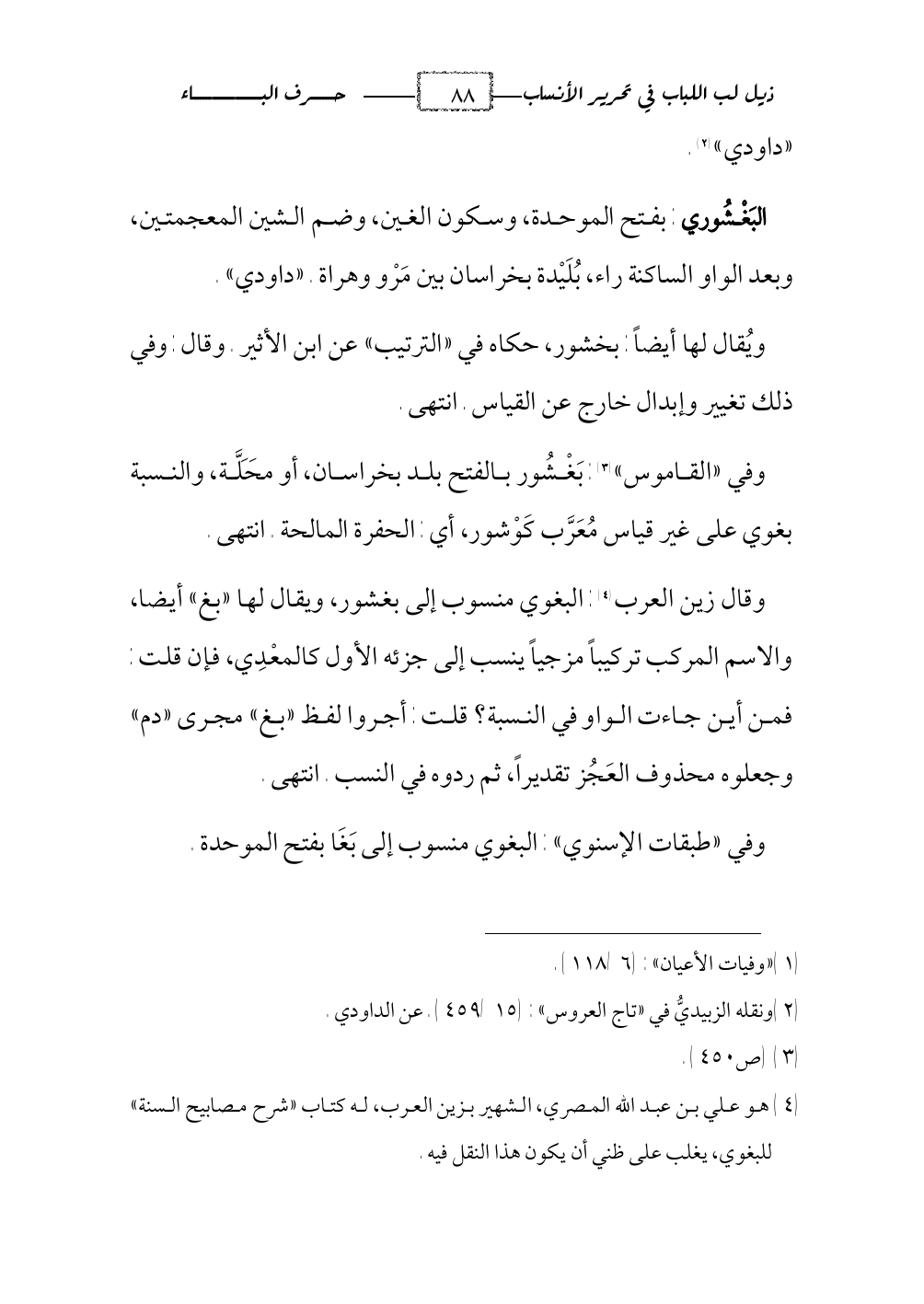 وقال ابن خلكان (¬1): نسبة إلى بلدة بخراسان يقال لها بَغ وبَغور (¬2) بفتح الموحدة والغين المعجمة وبعدها واو، وهذه النسبة شاذة على خلاف القياس. قاله السمعاني في كتاب «الأنساب» (¬3).