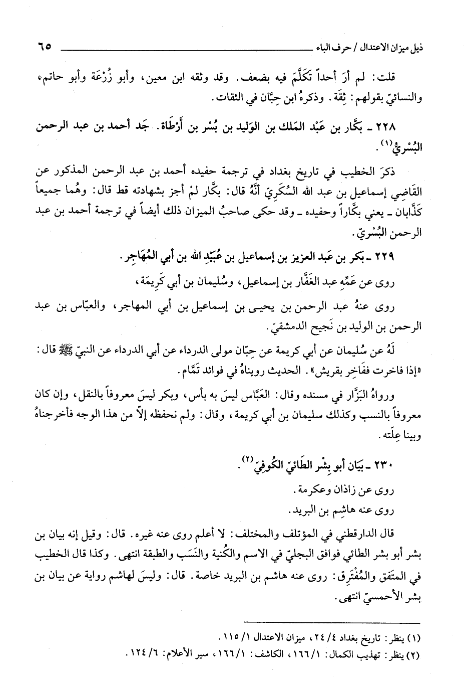 قَالَ الدَّارَقُطْنِيّ فِي المؤتلف والمختلف لَا أعلم روى عَنهُ غَيره قَالَ وَقيل إِنَّه بَيَان بن بشر أَبُو بشر الطَّائِي فَوَافَقَ البَجلِيّ فِي الِاسْم والكنية وَالنّسب والطبقة انْتهى وَكَذَا قَالَ الْخَطِيب فِي الْمُتَّفق والمفترق روى عَنهُ هَاشم بن الْبَرِيد خَاصَّة قَالَ وَلَيْسَ لهاشم رِوَايَة عَن بَيَان بن بشر الأحمسي انتهي