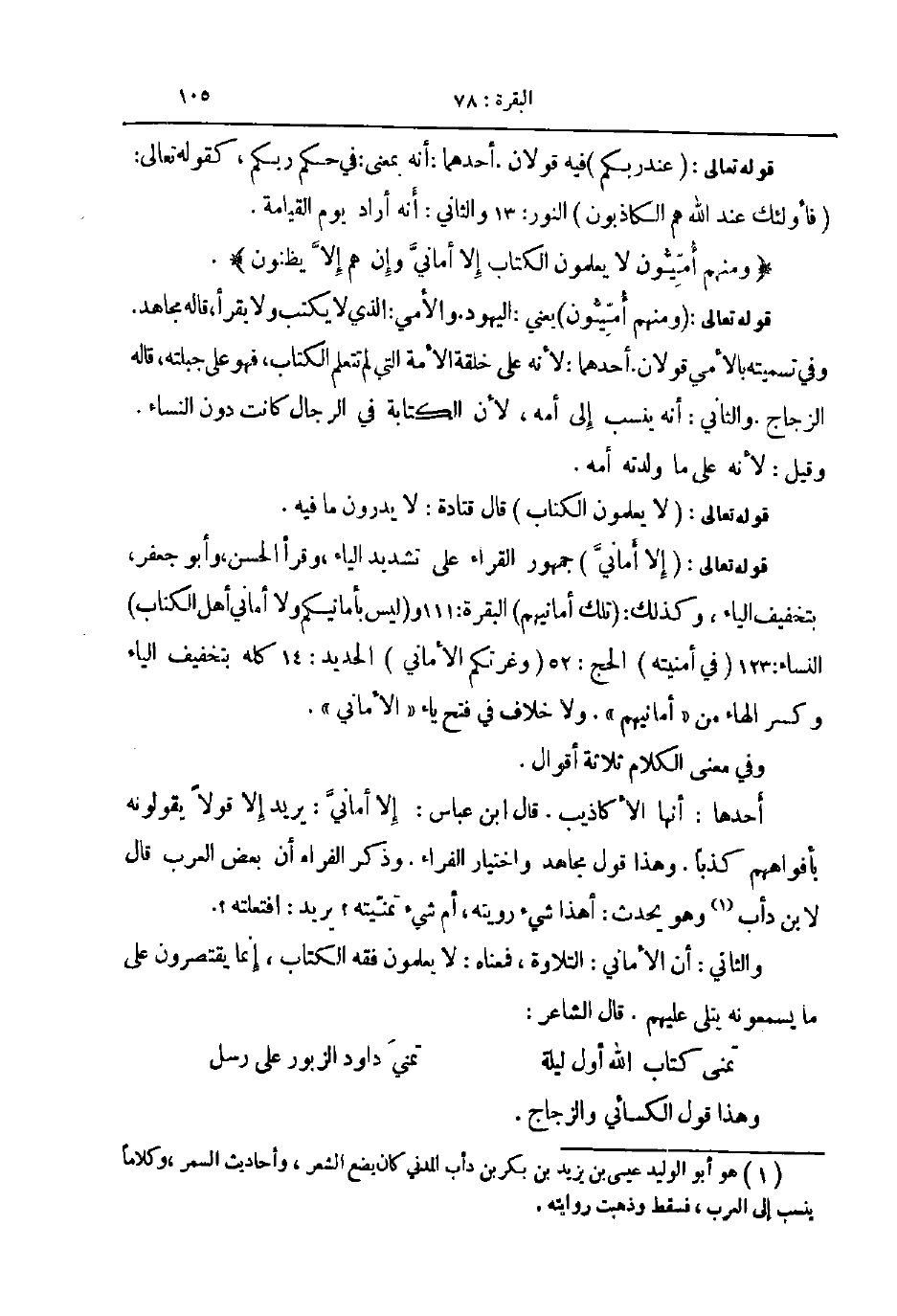 والثاني أن الأماني التلاوة فمعناه لايعلمون فقه الكتاب إنما يقتصرون على ما يسمعونه يتلى عليهم قال الشاعر ... تمنى كتاب الله أول ليلة ... تمني داود الزبور على رسل ...