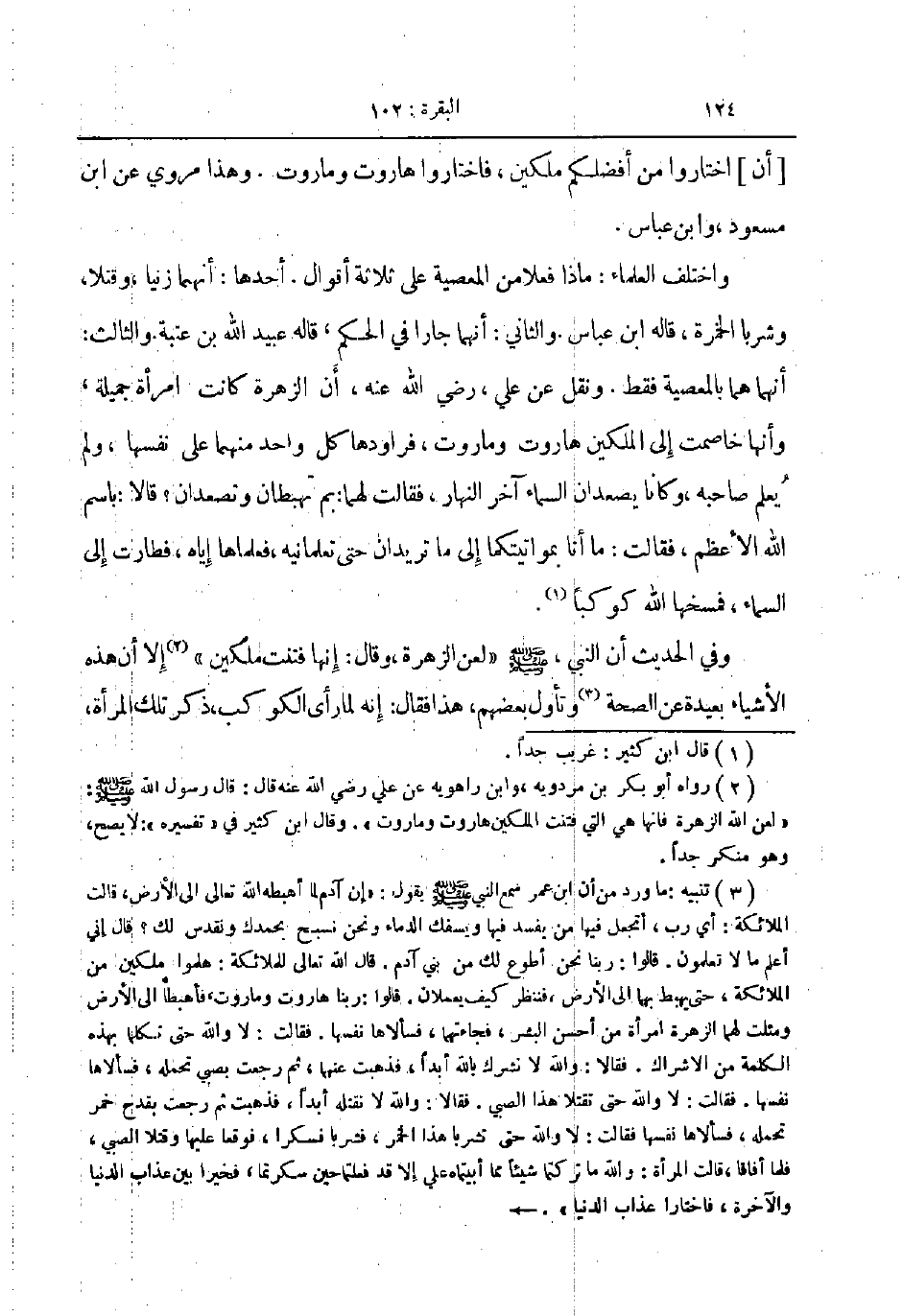 واختلف العلماء ماذا فعلا من المعصية على ثلاثة أقوال احدها أنهما زنيا وقتلا وشربا الخمرة قاله ابن عباس والثاني انهما جارا في الحكم قاله عبيد الله بن عتبة والثالث انهما هما بالمعصية فقط ونقل عن علي رضي الله عنه ان الزهرة كانت امرأة جميلة وانها خاصمت الى المللكين هاروت وماروت فراودها كل واحد منهما على نفسها ولم يعلم صاحبه وكانا يصعدان السماء آخر النهار فقالت لهما بم تهبطان وتصعدان قالا باسم الله الأعظم فقالت ما أما بمواتيتكما الى ما تريدان حتى تعلمانيه فعلماها إياه فطارت الى السماء فمسخها الله كوكبا