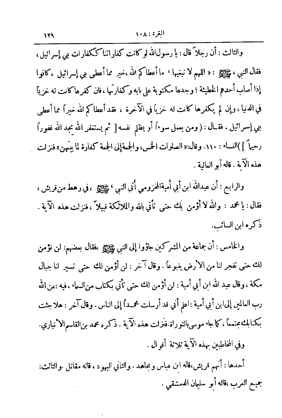 والثالث ان رجلا قال يا رسول الله لو كانت كفارتنا ككفارات بني اسرائيل فقال النبي صلى الله عليه و سلم اللهم لا نبغيها ما أعطاكم الله خير مما أعطى بني اسرائيل كانوا إذا أصاب أحدهم الخطيئة وجدها مكتوبة على بابه وكفارتها فان كفرها كانت له خزينا في الدنيا وإن لم يكفرها كانت له خزيا في الآخرة فقد أعطاكم الله خيرا مما أعطى بني اسرائيل فقال ومن يعمل سوءا أو يظلم نفسه ثم يستغفر الله يجد الله غفورا رحيما النساء 110 وقال الصلوات الخمس والجمعة الى الجمعة كفارة لما بينهن فنزلت هذه الآية قال أبوالعالية