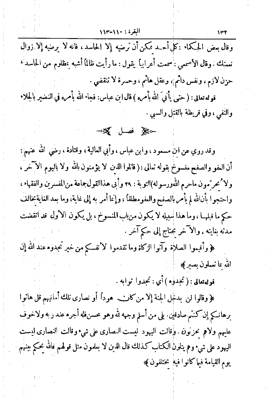 وقد روي عن ابن مسعود و ابن عباس و أبي العالية وقتادة رضي الله عنهم ان العفو والصفح منسوخ بقوله تعالى قاتلوا الذين لا يؤمنون بالله ولا باليوم الىخر ولا يحرمون ما حرم الله ورسوله التوبة 29 وأبى هذا القول جماعة من المفسرين والفقهاء واحتجوا بأن الله لم يأمر بالصفح والعفو مطلقا وإنما أمر به الى غاية وما بعد الغاية يخالف حكم ما قبلها وما هذا سبيله لا يكون من باب المنسوخ بل يكون الأول قد انقضت مدته بغايته والآخر يحتاج الى حكم آخر