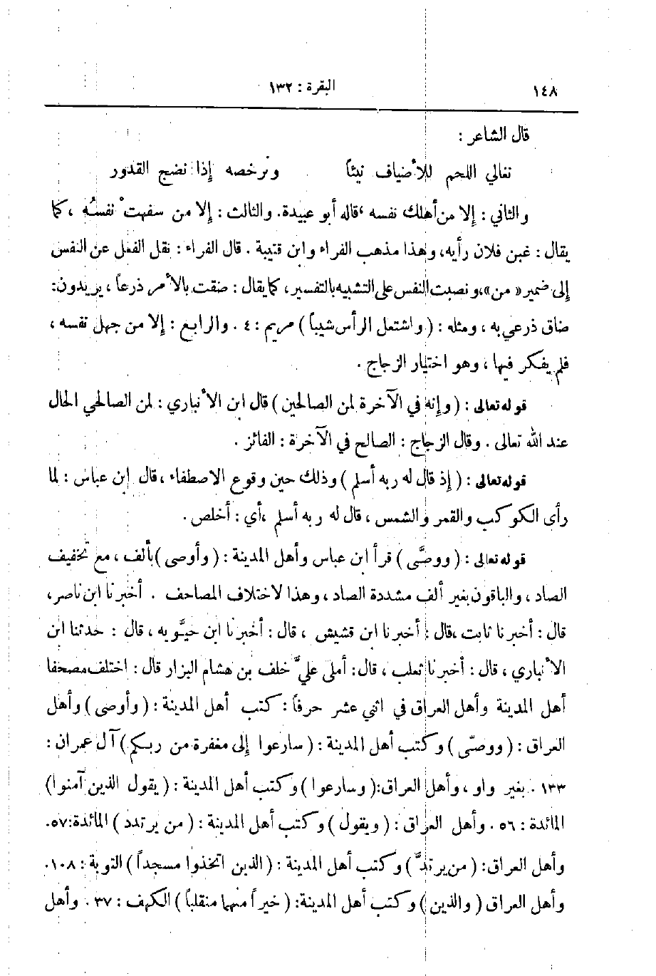 قوله تعالى ووصى قرأ بان عباس وأهل المدينة وأوصى بألف مع تخفيف الصاد والباقون بغير ألف مشددة الصاد وهذا لاختلاف المصاحف اخبرنا أبن ناصر قال أخبرنا ثابت قال أخبرنا ابن قشيش قال اخبرنا ابن حيويه قال حدثنا ابن الانباري قال أخبرنا ثعلب قال أملى علي خلف بن هشام البزار قال اختلف مصحفا أهل المدينة وأهل العراق في اثني عشر حرفا كتب اهل المدينة وأوصى وأهل العراق ووصى وكتب أهل المدينة سارعوا إلى مغفرة من ربكم آل عمران 133 بغير واو وأهل العراق وسارعوا وكتب اهل المدينة يقول الذين آمنوا المائدة 56 وأهل العراق ويقول وكتب أهل المدينة من يرتدد المائدة 57 وأهل العراق من يرتد وكتب أهل المدينة الذين اتخذوا مسجدا التوبة 108 و أهل العراق والذين وكتب أهل المدينة خيرا منهما منقلبا الكهف 37 و أهل