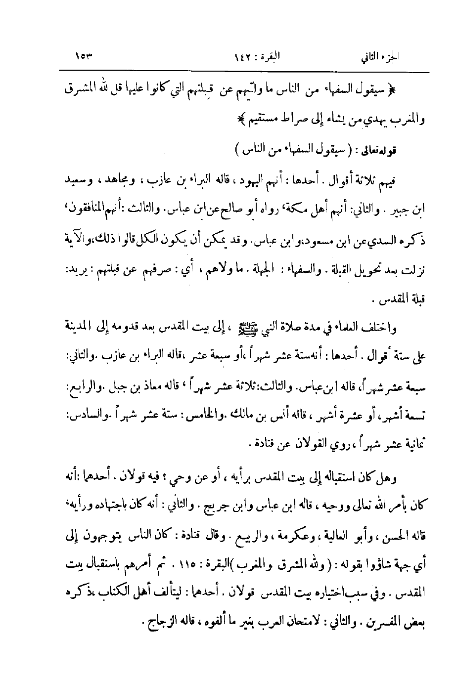 فيهم ثلاثة أقوال أحدها انهم اليهود قاله البراء بن عازب و مجاهد وسعيد ابن جبير والثاني انهم أهل مكة رواه أبو صالح عن ابن عباس والثالث انهم المنافقون ذكره السدي عن اين مسعود وابن عباس وقد يمكن أن يكون الكل قالوا ذلك والاية نزلت بعد تحويل القبلة والسفهاء الجهلة ما ولاهم أي صرفهم عن قبلتهم يريد قبلة المقدس