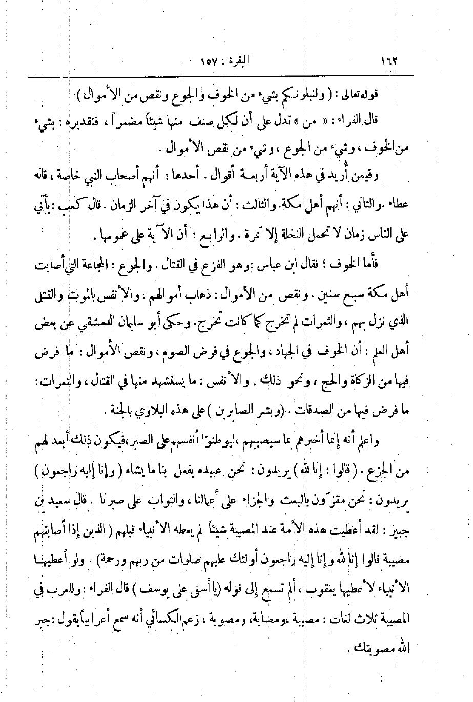 فأما الخوف فقال ابن عباس وهو الفزع في القتال والجوع المجاعة التي اصابت أهل مكة سبع سنين ونقص من الأموال ذهاب أموالهم والأنفس بالموت والقتل الذي نزل بهم والثمرات لم تخرج كما كانت تخرج وحكى أبو سليمان الدمشقي عن بعض أهل العلم أن الخوف في الجهاد والجوع في فرض الصوم ونقص الأموال ما فرض فيها من الزكاة والحج ونحو ذلك والأنفس ما يستشهد منها في القتال والثمرات ما فرض فيها من الصدقات وبشر الصابرين على هذه البلاوي بالجنة