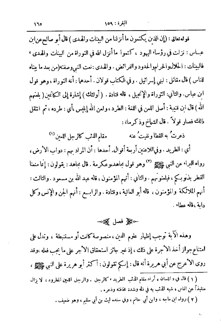 أي الطريد وفي اللاعنين اربعة أقوال أحدها أن المراد بهم دواب الأرض رواه البراء عن النبي صلى الله عليه و سلم وهو قول مجاهد و عكرمة قال مجاهد يقولون إنما منعنا القطر بذنوبكم فيلعنونهم والثاني انهم المؤمنون قاله عبد الله بن مسعود والثالث انهم الملائكة والمؤمنون قاله أبوالعالية وقتادة والرابع انهم الجن والإنس وكل دابة قاله عطاء