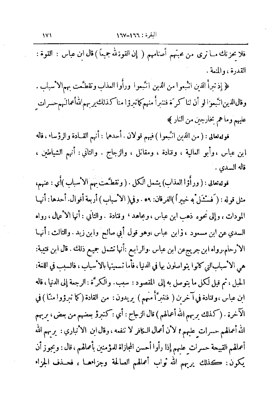 قوله تعالى ورأؤا العذاب يشمل الكل وتقطعت بهم الأسباب أي عنهم مثل قوله فسئل به خبيرا الفرقان 59 وفي الأسباب أربعة أقوال أحدها أنها المودات و إلى نحوه ذهب ابن عباس و مجاهد وقتادة والثاني أنها الأعمال رواه السدي عن ابن مسعود و ابن عباس وهو قول ابي صالح وابن زيد والثالث أنها الأرحام رواه أبن جريج عن ابن عباس والرابع أنها تشمل جميع ذلك قال ابن قتيبة هي الأسباب التي كانوا يتواصلون بها في الدنيا فأما تسميتها بالأسباب فالسبب في اللغة الحبل ثم قيل لكل ما يتوصل به إلى المقصود سبب والكرة الرجعة إلى الدنيا قاله ابن عباس وقتادة في آخرين فنتبرأ منهم يريدون من القادة كما تبرؤوا منا في الآخرة كذلك يريهم الله أعمالهم قال الزجاج أي كتبرؤ بعضهم من بعض يريهم الله أعمالهم حسرات عليهم لأن أعمال الكافر لا تنفعه وقال ابن الأنباري يريهم الله أعمالهم القبيحة حسرات عليهم إذا رأوا أحسن المجازاة للمؤمنين بأعمالهم قال ويجوز أن يكون كذلك يريهم الله ثواب أعمالهم الصالحة وجزاءها فخذق ! الجزاء