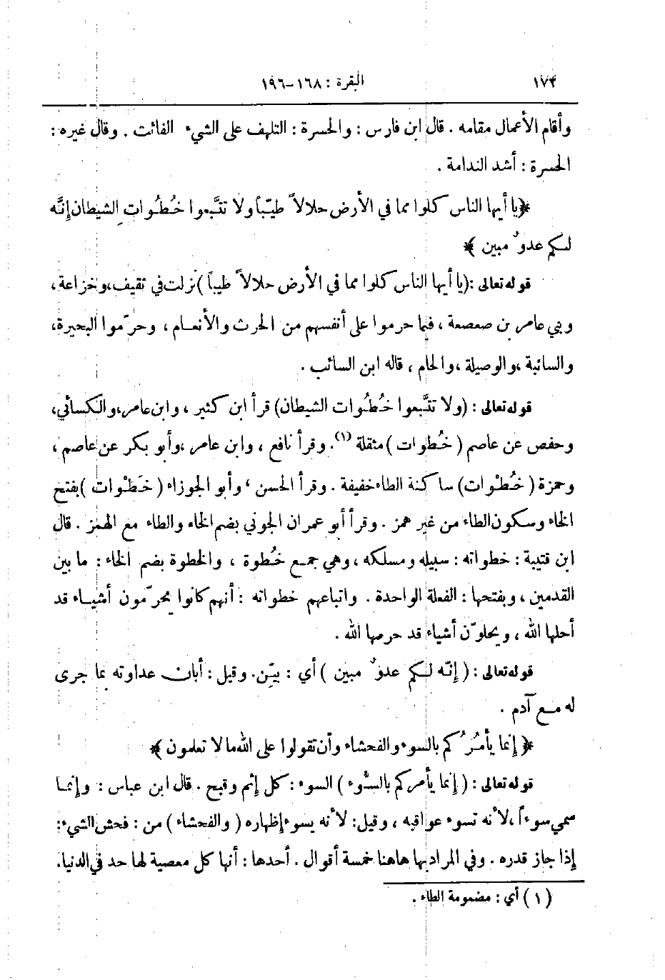 قوله تعالى ولا تتبعوا خطوات الشيطان قرأ ابن كثير وابن عامر والكسائي وحفص عن عاصم خطوات مثقلة وقرا نافع وابن عامر وابو بكر عن عاصم وحمزة خطوات ساكنة الطاء خفيفة وقرا الحسن و أبو الجوزاء خطوات بفتح الخاء وسكون الطاء من غير همز وقرا أبو عمران الجوني بضم الخاء والطاء مع الهمز قاله ابن قتيبة خطواته سبيله ومسلكه وهي جمع خطوة والخطوة بضم الخاء ما بين القدمين وبفتحها الفعلة الواحدة واتباعهم خطواته أنهم كانوا يحرمون أشياء قد احلها الله ويخلون أشياء قد حرمها الله