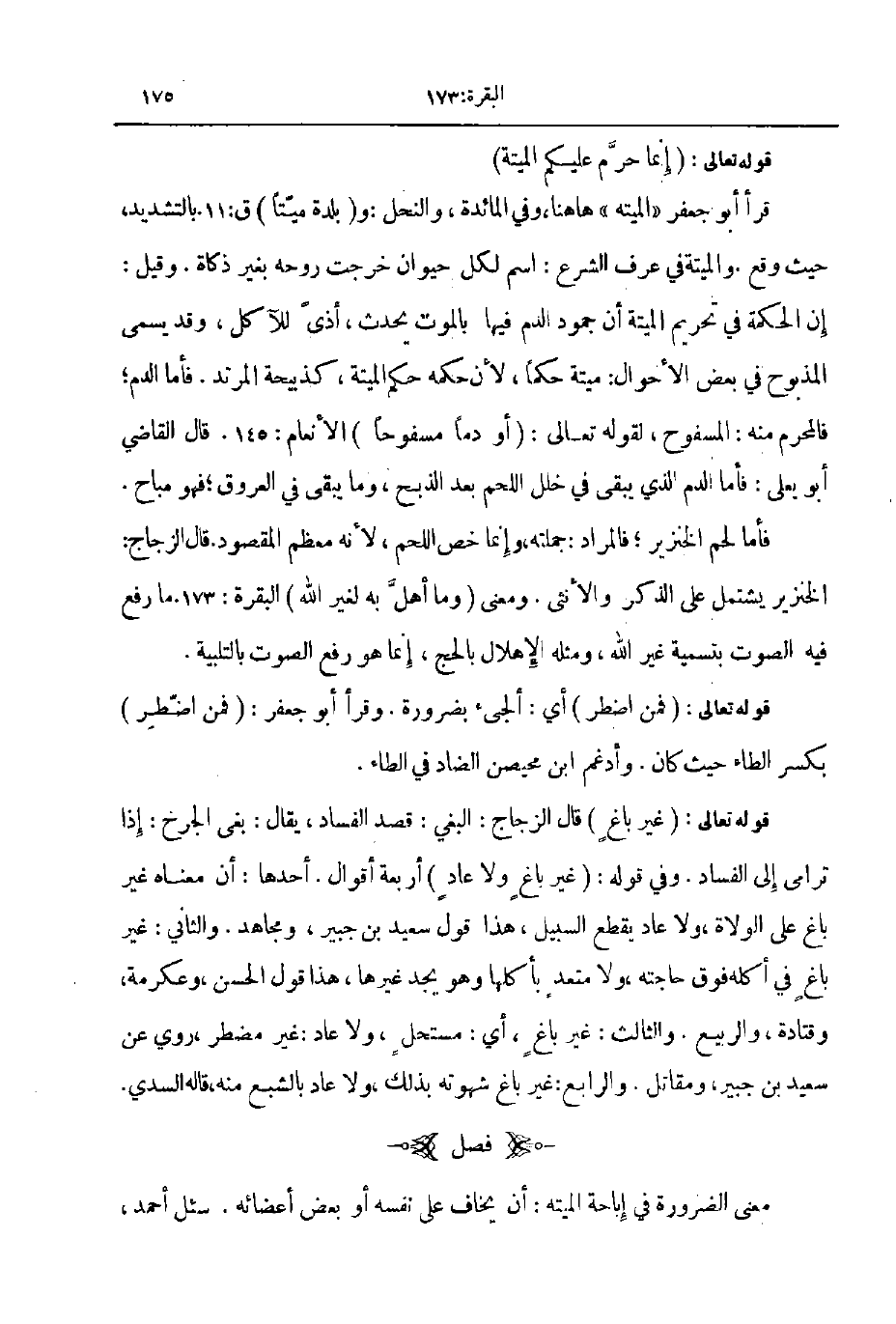 قرأ أبو جعفر الميتة هاهنا وفي المائدة والنحل و بلدة ميتا ق11 بالتشديد حيث وقع والميتة في عرف الشرع اسم لكل حيوان خرجت روحه بغير ذكاة وقيل إن الحكمة في تحريم الميتة أن جمود الدم فيها بالموت يحدث أذى للآكل وقد يسمى المذبوح في بعض الأحوال ميتة حكما لأن حكمه حكم الميتة كذبيحة المرتد فأما الدم فالمحرم منه المسفوح لقوله تعالى أو دما مسفوحا الأنعام 145 قال القاضي أبو يعلى فأما الدم الذي يبقى في خلل اللحم بعد الذبح وما يبقى في العروق فهو مباح