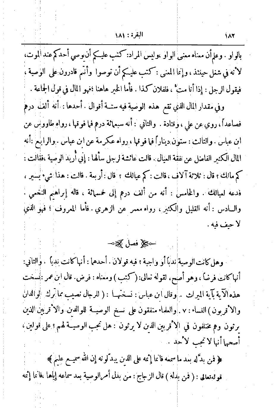 وهل كانت الوصية ندبا أو واجبة فيه قولان أحدهما أنها كانت ندبا والثاني أنها كانت فرضا وهو أصح لقوله تعالى كتب ومعناه فرض قال ابن عمر نسخت هذه الآية بآية الميرات وقال ابن عباس نسختها للرجال نصيب مما ترك الوالدان والأقربون النساء 7 والعلماء متفقون على نسخ الوصية للوالدين والأقربين الذين يرثون وهم مختلفون في الأقربين الذين لا يرثون هل تجب الوصية لهم على قولين اصحهما أنها لا تجب لأحد