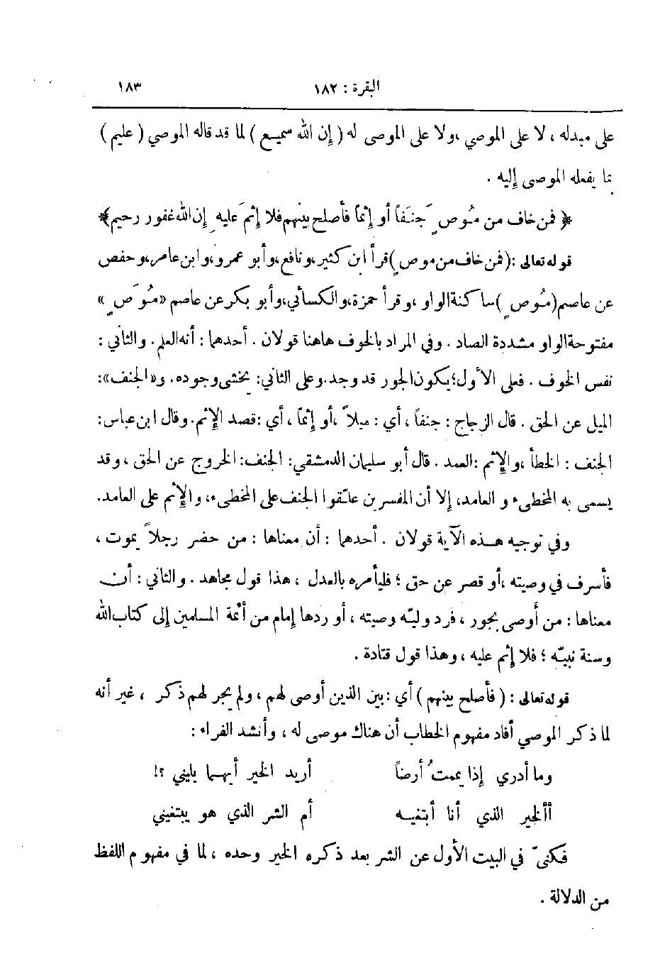 وفي توجيه هذه الآية قولان أحدهما أن معناه من حضر رجلا يموت فأسرف في وصيته أو قصر عن حق فليأمره بالعدل هذا قول مجاهد والثاني أن معناه من اوصى بجور فرد وليه وصيته أو ردها إمام من أئمة المسلمين إلى كتاب الله وسنة نبيه فلا إثم عليه وهذا قول قتادة