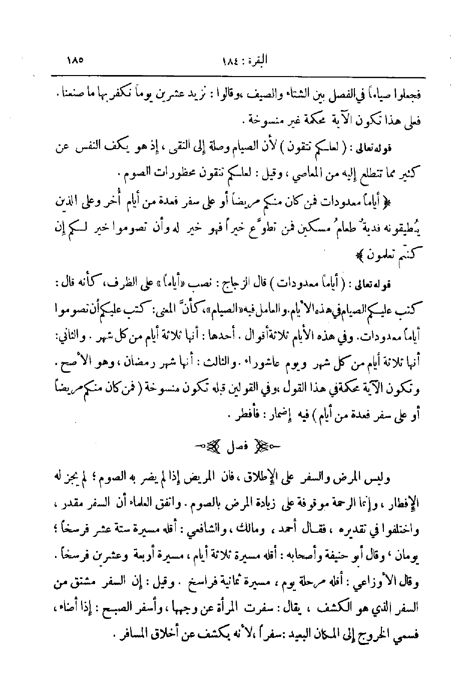 وليس المرض والسفر على الإطلاق فان المريض إذا لم يضر به الصوم لم يجز له الإفطار وإنما الرحمة موقوفة على زيادة المرض بالصوم واتفق العلماء أن السفر مقدر واختلفوا في تقديره فقال احمد ومالك والشافعي أقله مسيرة ستة عشر فرسخا يومان وقال أبو حنيفة وأصحابه أقله مسيرة ثلاثة أيام مسيرة اربعة وعشرين فرسخا وقال الأوزاعي أقله مرحلة يوم مسيرة ثمانية فراسخ وقيل إن السفر مشتق من السفر الذي هو الكشف يقال سفرت المرأة عن وجهها وأسفر الصبح إذا أضاء فسمي الخروج إلى المكان البعيد سفرا لأنه يكشف عن أخلاق المسافر