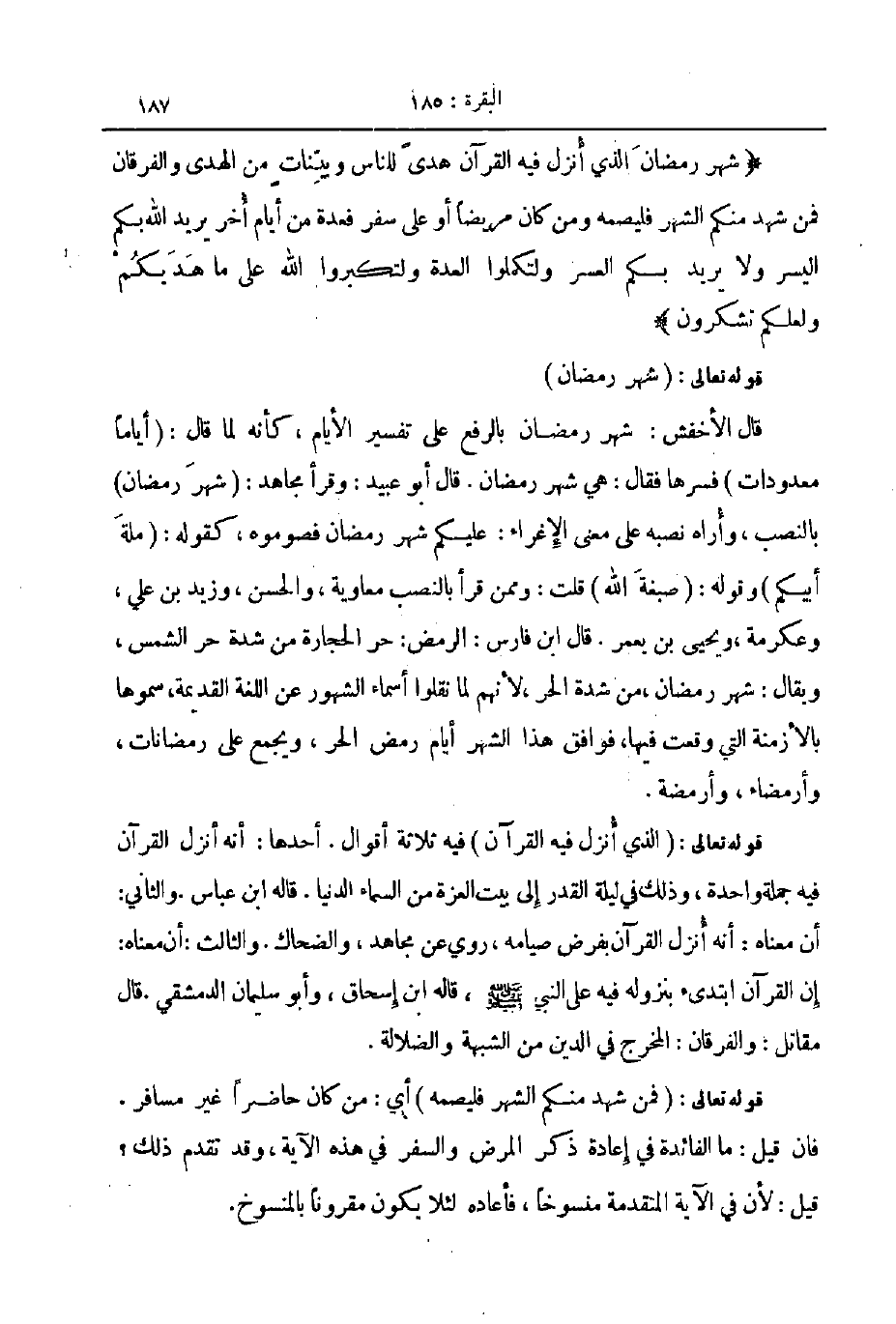 شهر رمضان الذي انزل فيه القرآن هدى للناس وبينات من الهدى والفرقان فمن شهد منكم الشهر فليصمه ومن كان مريضا أو على سفر فعدة من أيام أخر يريد الله بكم اليسر ولا يريد بكم العسر ولتكملوا العدة ولتكبروا الله على ما هديكم ولعلكم تشكرون