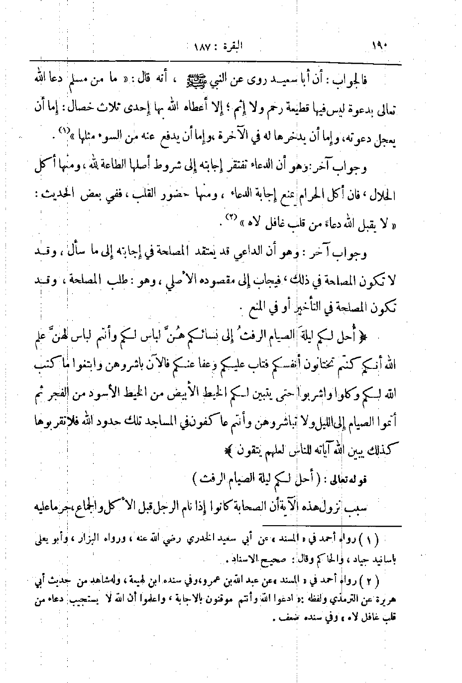 أحل لكم ليلة الصيام الرفث إلى نسائكم هن لباس لكم وأنتم لباس لهن علم الله انكم كنتم تختانون انفسكم فتاب عليكم وعفا عنكم فالآن باشروهن وابتغوا ما كتب الله لكم وكلوا واشربوا حتى يتبين لكم الخيط الابيض من الخيط الأسود من الفجر ثم أتموا الصيام إلى الليل ولا تباشروهن وأنتم عاكفون في المساجد تلك حدود الله فلا تقربوها كذلك يبين الله آياته للناس لعلهم يتقون