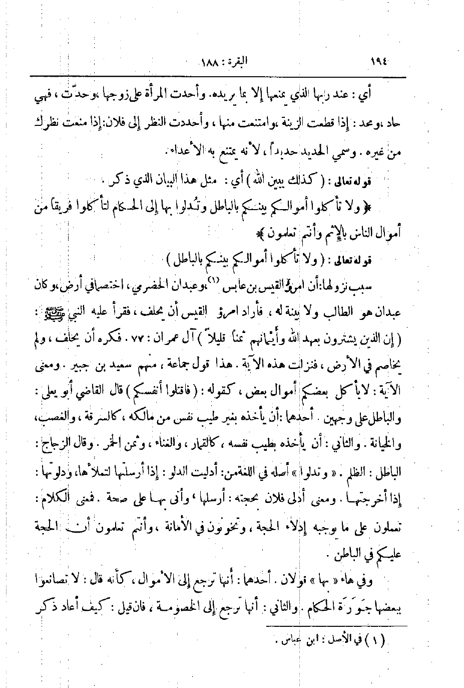 سبب نزولها أن امرؤ القيس بن عابس وعبدان الحضرمي اختصما في ارض وكان عبدان هو الطالب ولا بينة له فأراد امرؤ القيس أن خلف فقرأ عليه النبي صلى الله عليه و سلم إن الذين يشترون بعهد الله وأيمانهم ثمنا قليلا آل عمران 77 فكره أن خلف ولم يخاصم في الأرض فنزلت هذه الآية هذا قول جماعة منهم سعيد بن جبير ومعنى الآية لا يأكل بعضكم أموال بعض كقوله فاقتلوا أنفسكم قال القاضي أبو يعلي والباطل على وجهين أحدهما أن يأخذه بغير طيب نفس من مالكه كالسرقة والغصب والخيانة والثاني أن يأخذه بطيب نفسه كالقمار والغناء وثمن الخمر وقال الزجاج الباطل الظلم وتدلوا أصله في اللغة من أدليت الدلو إذا أرسلتها لتملأها ودلوتها إذا أخرجتها ومعنى أدلى فلان بحجته أرسلها وأتى بها على صحة فمعنى الكلام تعملون على ما يوجبه إدلاء الحجة وتخونون في الأمانة وأنتم تعلمون أن الحجة عليكم في الباطن