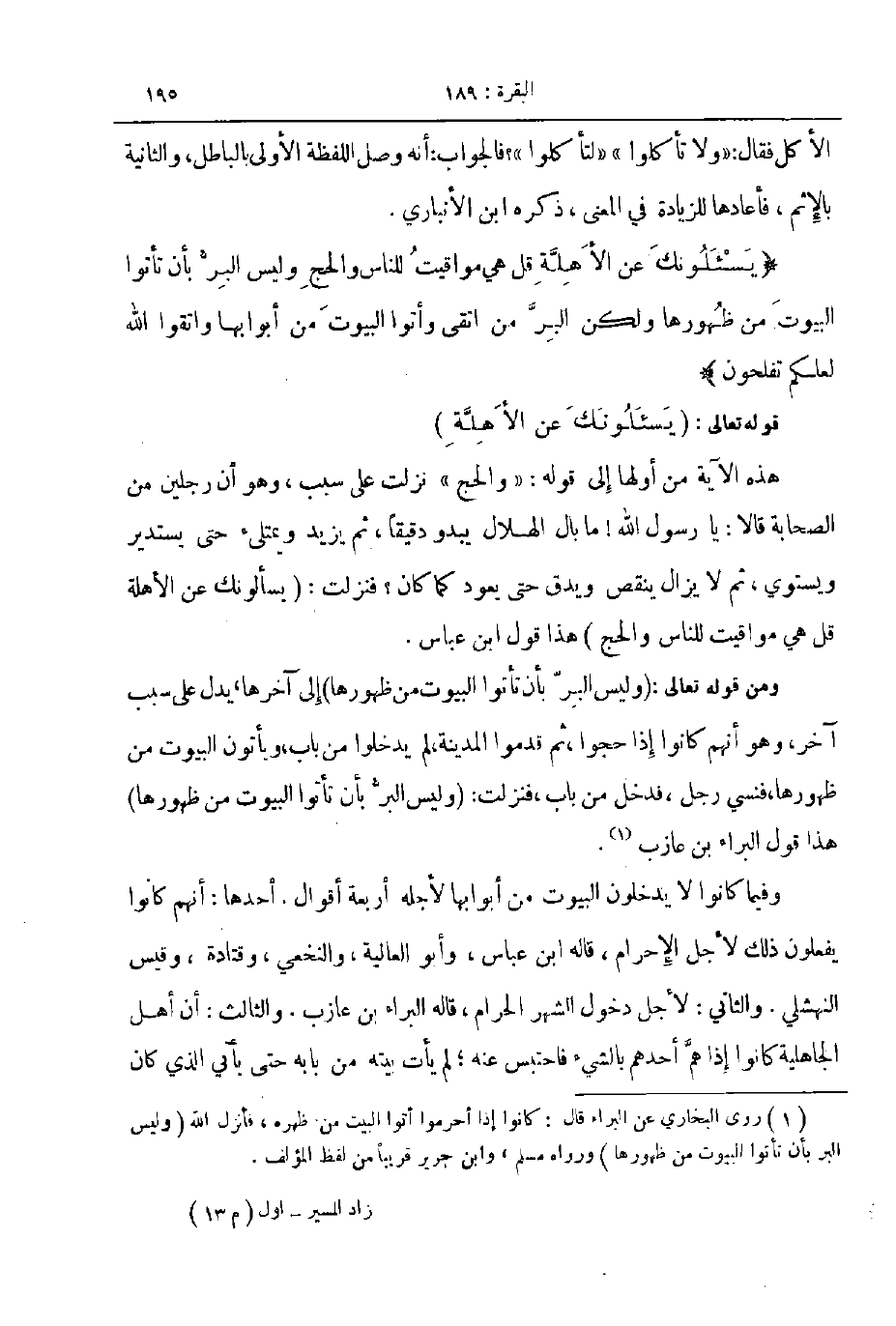 ومن قوله تعالى وليس البر بأن تأتوا البيوت من ظهورها إلى آخرها يدل على سبب آخر وهو انهم كانوا إذا حجوا ثم قدموا المدينة لم يدخلوا من باب ويأتون البيوت من ظهورها فنسي رجل فدخل من باب فنزلت وليس البر بأن تأتوا البيوت من ظهورها هذا قول البراء بن عازب