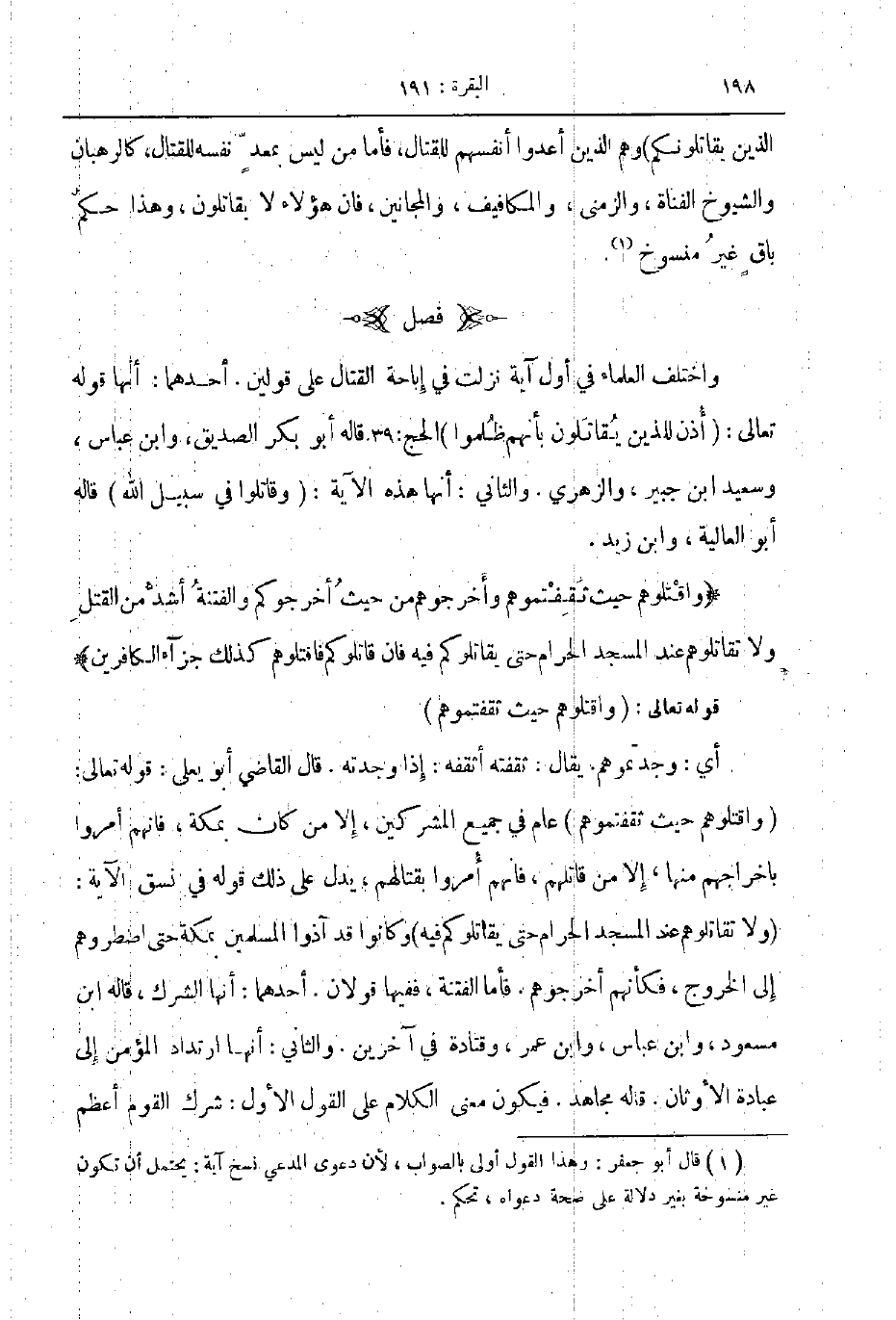 واختلف العلماء في اول اية نزلت في إباحة القتال على قولين أحدهما أنها قوله تعالى أذن للذين يقاتلون بأنهم ظلموا الحج 39 قاله أبو بكر الصديق و ابن عباس وسعيد بن جبير والزهري والثاني أنها هذه الآية وقاتلوا في سبيل الله قاله أبوالعالية و ابن زيد