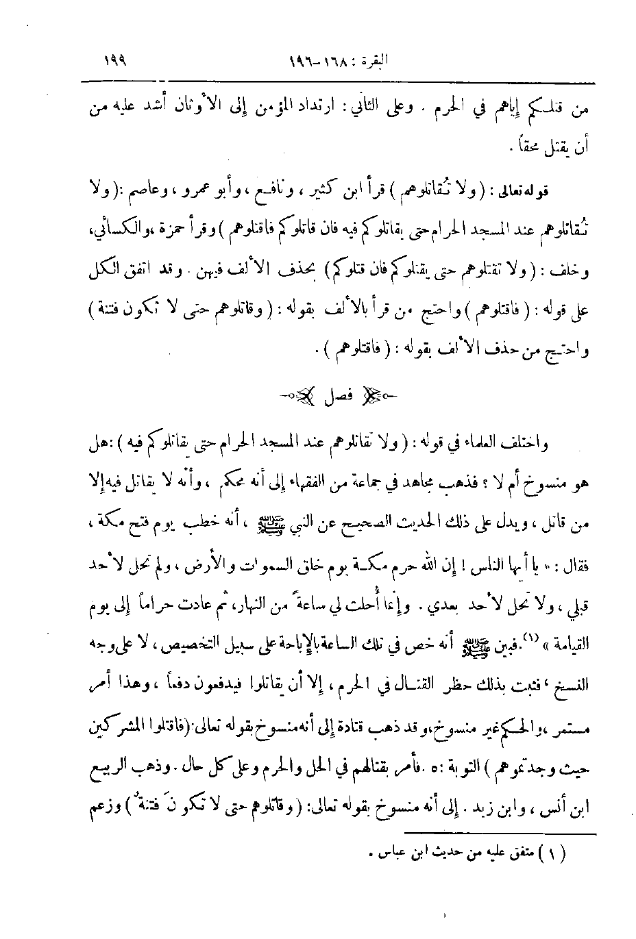 واختلف العلماء في قوله ولا تقاتلوهم عند المسجد الحرام حتى يقاتلوكم فيه هل هو منسوخ ام لا فذهب مجاهد في جماعة من الفقهاء إلى أنه محكم وانه لا يقاتل فيه الا من قاتل ويدل على ذلك الحديث الصحيح عن النبي صلى الله عليه و سلم أنه خطب يوم فتح مكة فقال يا أيها الناس إن الله حرم مكة يوم خلق السموات والارض ولم تحل لأحد قبلي ولا تحل لأحد بعدي وإنما أحلت لي ساعة من النهار ثم عادت حراما إلى يوم القيامة فبين صلى الله عليه و سلم أنه خص في تلك الساعة بالإباحة على سبيل التخصيص لا على وجه النسخ فثبت بذلك خطر القتال في الحرم إلا أن يقاتلوا فيدفعون دفعا وهذا أمر مستمر والحكم غير منسوخ وقد ذهب قتادة إلى أنه منسوخ بقوله تعالى فاقتلوا المشركين حيث وجدتموهم التوبة 5 فأمر بقتالهم في الحل والحرم وعلى كل حال وذهب الربيع ابن أنس و ابن زيد إلى أنه منسوخ بقوله تعالى وقاتلوهم حتى لا تكون فتنة وزعم