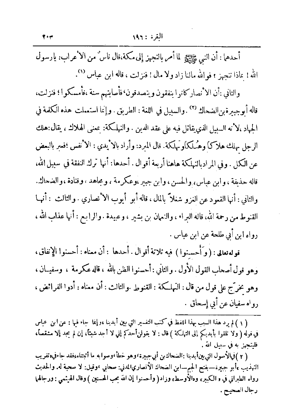 والثاني أن الأنصار كانوا ينفقون ويتصدقون فأصابتهم سنة فأمسكوا فنزلت قاله أبو جبيرة بن الضحاك والسبيل في اللغة الطريق و إنما استعملت هذه الكلمة في الجهاد لأنه السبيل الذي يقاتل فيه على عقد الدين والتهلكة بمعنى الهلاك يقال هلك الرجل يهلك هلاكا وهلكا وتهلكة قال المبرد وأراد بالأيدي الأنفس فعبر بالبعض عن الكل وفي المراد بالتهلكة هاهنا اربعة أقوال أحدها أنها ترك النفقة في سبيل الله قاله حذيفة و ابن عباس والحسن وابن جبير وعكرمة و مجاهد وقتادة والضحاك والثاني أنها القعود عن الغزو شغلا بالمال قاله أبو أيوب الانصاري والثالث أنها القنوط من رحمة الله قاله البراء والنعمان بن بشير وعبيدة والرابع أنها عذاب الله رواه ابن ابي طلحة عن ابن عباس