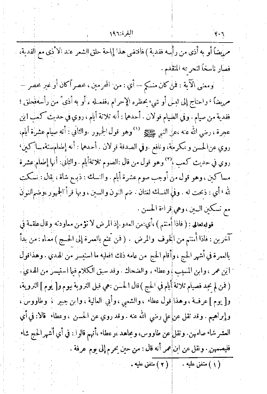 ومعنى الآية فمن كان منكم أي من المحرمين محصرا كان أو غير محصر مريضا واحتاج إلى لبس أو شيء يحظره الإحرام ففعله أو به أذى من رأسه فحلق ففدية من صيام وفي الصيام قولان أحدهما أنه ثلاثة ايام روي في حديث كعب بن عجرة رضي الله عنه عن النبي صلى الله عليه و سلم وهو قول الجمهور والثاني أنه صيام عشرة ايام روي عن الحسن وعكرمة ونافع وفي الصدقة قولان أحدهما أنه إطعام ستة مساكين روي في حديث كعب وهو قول من قال الصوم ثلاثة ايام والثاني أنها إطعام عشرة مساكين وهو قول من أوجب صوم عشرة ايام والنسك ذبح شاة يقال نسكت لله أي ذبحت له وفي النسك لغتان ضم النون والسين وبها قرأ الجمهور وضم النون مع تسكين السين وهي قراءة الحسن