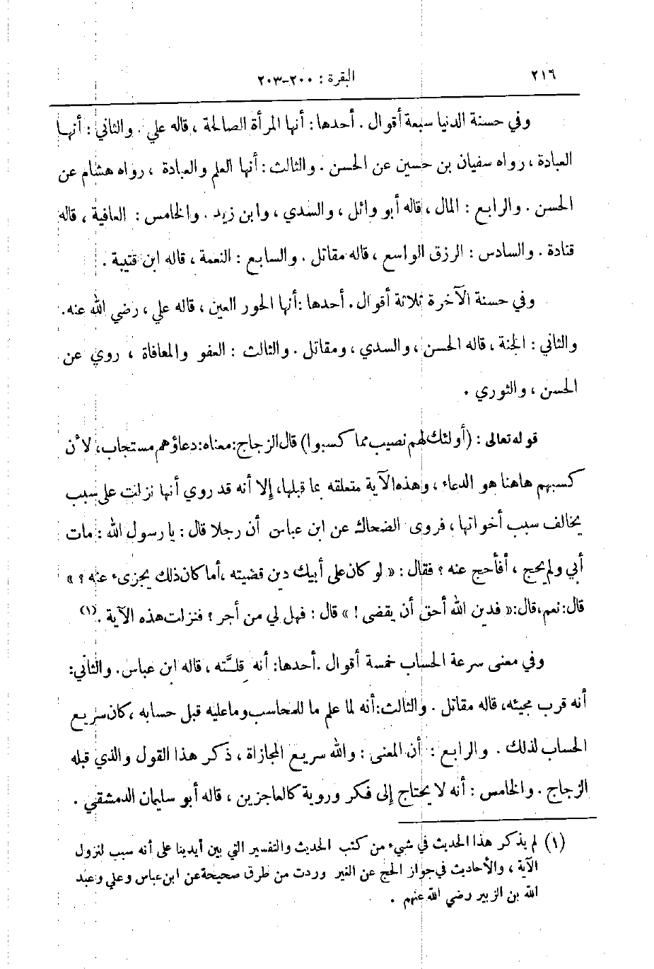وفي حسنة الآخرة ثلاثة اقوال أحدها أنها الحور العين قاله علي رضي الله عنه والثاني الجنة قاله الحسن والسدي و مقاتل والثالث العفو والمعافاة روي عن الحسن والثوري