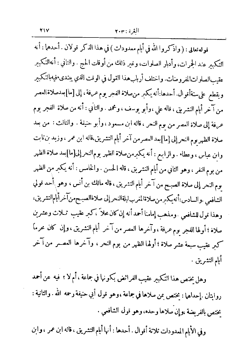 قوله تعالى واذكروا الله في أيام معدودات في هذا الذكر قولان أحدهما أنه التكبير عند الجمرات وأدبار الصلوات وغير ذلك من أوقات الحج والثاني أنه التكبير عقيب الصلوات المفروضات واختلف ارباب هذا القول في الوقت الذي يبتدىء فيه بالتكبير ويقطع على ستة أقوال أحدها أنه يكبر من صلاة الفجر يوم عرفة إلى ما بعد صلاة العصر من آخر أيام التشريق قاله علي وابو يوسف ومحمد والثاني أنه من صلاة الفجر يوم عرفة إلى صلاة العصر من يوم النحر قاله ابن مسعود وابو حنيفة والثالث من بعد صلاة الظهر يوم النحر إلى ما بعد العصر من آخر أيام التشريق قاله ابن عمر وزيد بن ثابت و ابن عباس وعطاء والرابع أنه يكبر من صلاة الظهر يوم النحر إلى ما بعد صلاة الظهر من يوم النفر وهو الثاني من أيام التشريق قاله الحسن والخامس أنه يكبر من الظهر يوم النحر إلى صلاة الصبح من آخر أيام التشريق قاله مالك بن أنس وهو أحد قولي الشافعي والسادس أنه يكبر من صلاة المغرب ليلة النحر إلى صلاة الصبح من آخر أيام التشريق وهذا قول للشافعي ومذهب إمامنا أحمد أنه كان محلا كبر عقيب ثلاث وعشرين صلاة أولها الفجر يوم عرفة وآخرها العصر من آخر أيام التشريق وان كان محرما كبر عقيب سبعة عشر صلاة اولها الظهر من يوم النحر وآخرها العصر من آخر أيام التشريق