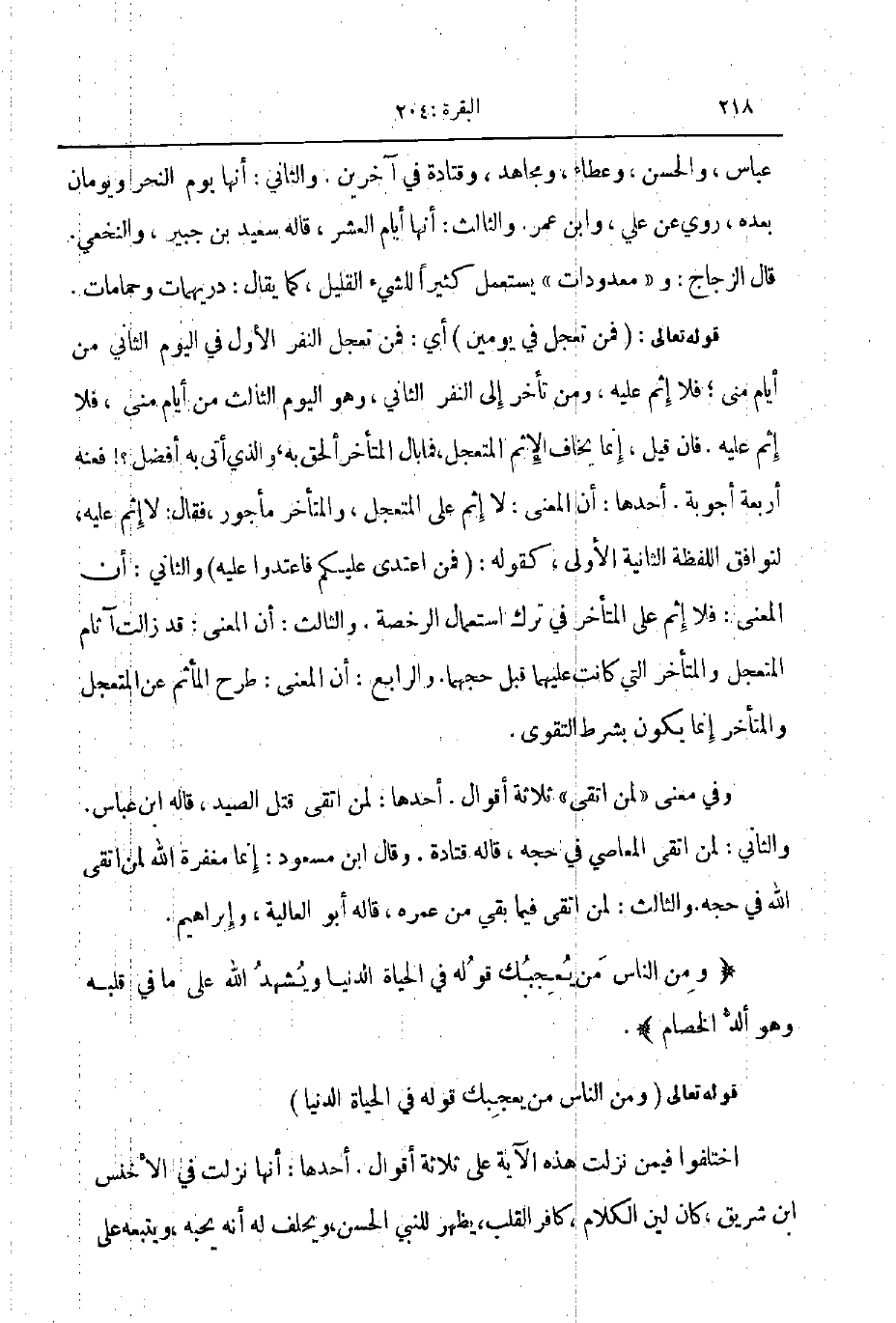 قوله تعالى فمن تعجل في يومين أي فمن تعجل النفر الأول في اليوم الثاني من أيام منى فلا إثم عليه ومن تأخر إلى النفر الثاني وهو اليوم الثالث من أيام منى فلا إثم عليه فان قيل إنما يخاف الإثم المتعجل فما بال المتأخر ألحق به والذي أتى به أفضل فعنه اربعة أجوبة أحدها أن المعنى لا إثم على المتعجل والمتأخر مأجور فقال لا إثم عليه لتوافق اللفظة الثانية الاولى كقوله فمن اعتدى عليكم فاعتدوا عليه والثاني أن المعنى فلا إثم على المتأخر في ترك استعمال الرخصة والثالث أن المعنى قد زالت آثام المتعجل والمتأخر التي كانت عليها قبل حجهما والرابع أن المعنى طرح المأثم عن المتعجل والمتأخر إنما يكون بشرط التقوى