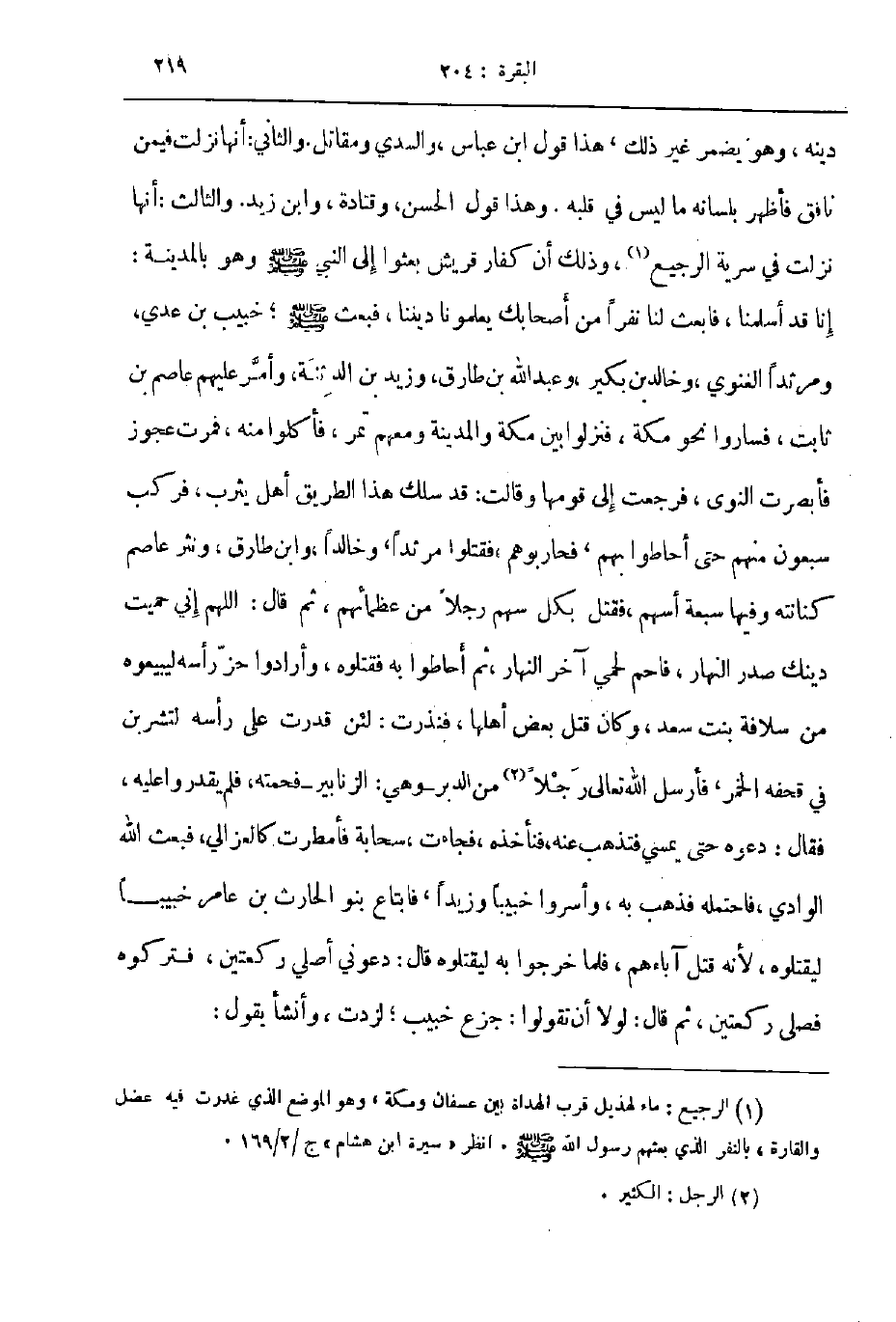 دينه وهو يضمر غير ذلك هذا قول ابن عباس والسدي و مقاتل والثاني أنها نزلت فيمن نافق فأظهر بلسانه ما ليس في قلبه وهذا قول الحسن وقتادة وابن زيد والثالث أنها نزلت في سرية الرجيع وذلك أن كفار قريش بعثوا إلى النبي صلى الله عليه و سلم وهو بالمدينة إنا قد اسلمنا فابعث لنا نفرا من أصحابك يعلمونا ديننا فبعث صلى الله عليه و سلم خبيب بن عدي ومرثدا الغنوي وخالد بن بكير وعبد الله بن طارق وزيد بن الدثنة وأمر عليهم عاصم بن ثابت فساروا نحو مكة فنزلوا بين مكة والمدينة ومعهم تمر فأكلوا منه فمرت عجوز فأبصرت النوى فرجعت إلى قومها وقالت قد سلك هذا الطريق أهل يثرب فركب سبعون منهم حتى احاطوا بهم فحاربوهم فقتلوا مرثدا وخالدا وابن طارق ونثر عاصم كنانته وفيها سبعة أسهم فقتل بكل سهم رجلا من عظمائهم ثم قال اللهم اني حميت دينك صدر النهار فاحم لحمي آخر النهار ثم احاطوا به فقتلوه وأرادوا حز رأسه يبيعوه من سلافة بنت سعد وكان قتل بعض اهلها فنذرت لئن قدرت على رأسه لتشربن في قحفه الخمر فأرسل الله تعالى رجلا من الدبر وهي الزنابير فحمته فلم يقدروا عليه فقال دعوه حتى يمسي فتذهب عنه فنأخذه فجاءت سحابة فأمطرت كالعزالي فبعث الله الوادي فاحتمله فذهب به وأسروا خبيبا وزيدا فابتاع بنو الحارث بن عامر خبيبا ليقتلوه لأنه قتل آباءهم فلما خرجوا به ليقتلوه قال دعوني أصلي ركعتين فتركوه فصلى ركعتين ثم قال لولا أن تقولوا جزع خبيب لزدت وأنشأ يقول