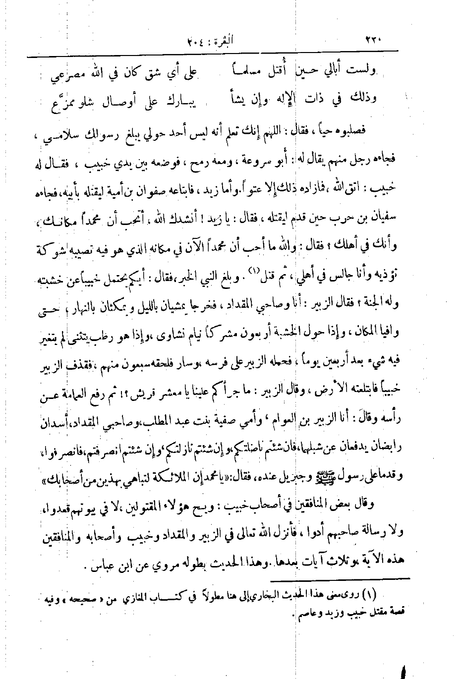 فصلبوه حيا فقال اللهم إنك تعلم أنه ليس احد حولي يبلغ رسولك سلامي فجاءه رجل منهم يقال له أبو سروعة ومعه رمح فوضعه بين يدي خبيب فقال له خبيب اتق الله فما زاده ذلك إلا عتوا وأما زيد فابتاعه صفوان بن أمية ليقتله بأبيه فجاءه سفيان بن حرب حين قدم ليقتله فقال يا زيد أنشدك الله أتحب أن محمدا مكانك وأنك في أهلك فقال والله ما أحب أن محمدا الآن في مكانه الذي هو فيه تصيبه شوكة تؤذيه وأنا جالس في أهلي ثم قتل وبلغ النبي الخبر فقال أيكم يحتمل خبيبا عن خشبته وله الجنة فقال الزبير انا وصاحبي المقداد فخرجا يمشيان بالليل ويمكثان بالنهار حتى وافيا المكان و إذا حول الخشبة أربعون مشركا نيام نشاوى و إذا هو رطب يتثنى لم يتغير فيه شيء بعد أربعين يوما فحمله الزبير على فرسه وسار فلحقه سبعون منهم فقذف الزبير خبيبا فابتلعته الارض وقال الزبير ما جرأكم علينا يا معشر قريش ثم رفع العمامة عن رأسه وقال انا الزبير بن العوام وأمي صفية بنت عبد المطلب وصاحبي المقداد اسدان رابضان يدفعان عن شبلهما فان شئتم ناضلتكم وإن شئتم نازلتكم وإن شئتم انصرفتم فانصرفوا وقدما على رسول صلى الله عليه و سلم و جبريل عنده فقال يا محمد إن الملائكة لتباهي بهذين من أصحابك