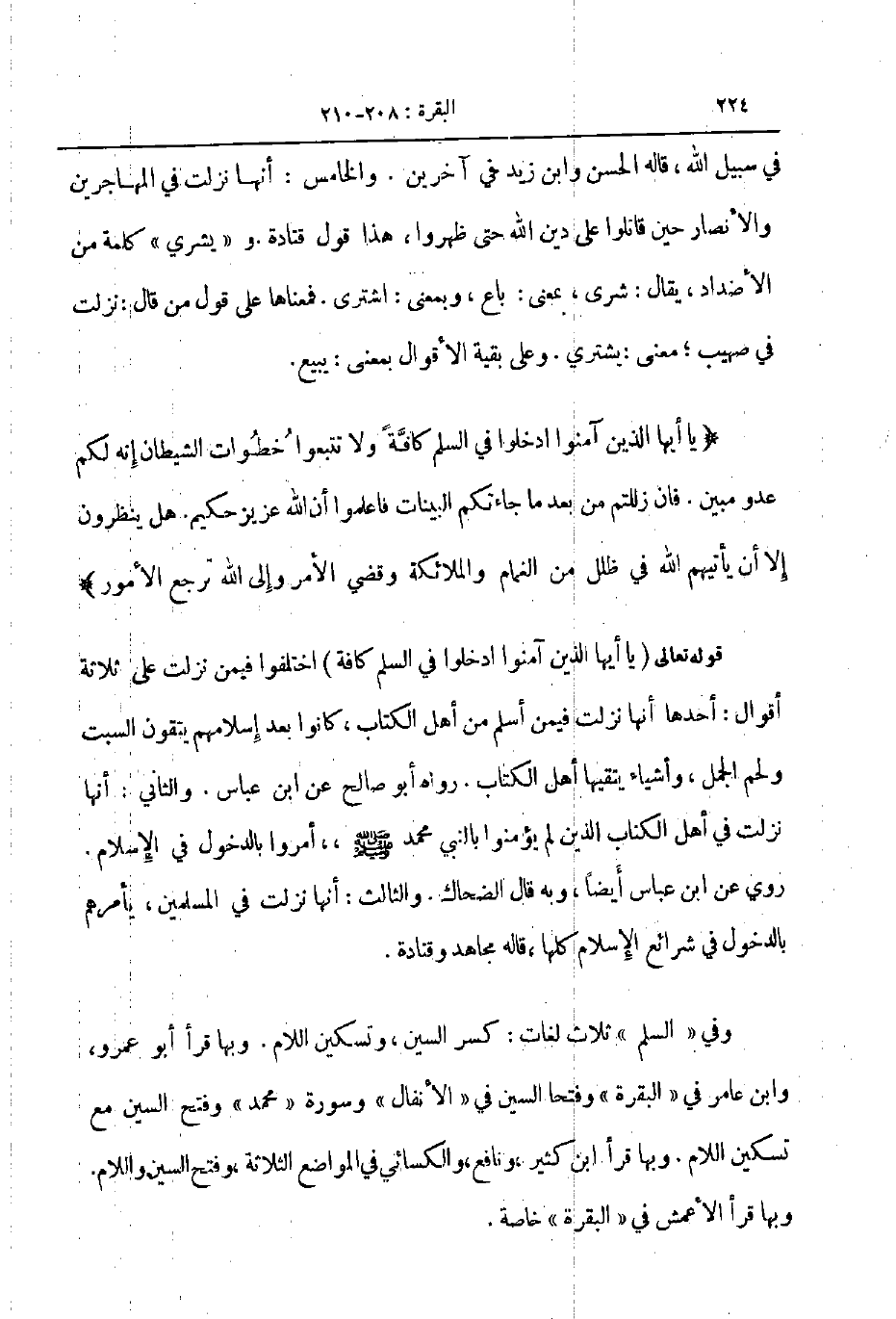 قوله تعالى يا أيها الذين آمنوا ادخلوا في السلم كافة اختلفوا فيمن نزلت على ثلاثة اقوال أحدها أنها نزلت فيمن اسلم من أهل الكتاب كانوا بعد إسلامهم يتقون السبت ولحم الجمل وأشياء يتقيها أهل الكتاب رواه أبو صالح عن ابن عباس والثاني أنها نزلت في أهل الكتاب الذين لم يؤمنوا بالنبي محمد صلى الله عليه و سلم أمروا بالدخول في الإسلام روي عن ابن عباس ايضا وبه قال الضحاك والثالث أنها نزلت في المسلمين يأمرهم بالدخول في شرائع الإسلام كلها قاله مجاهد وقتادة