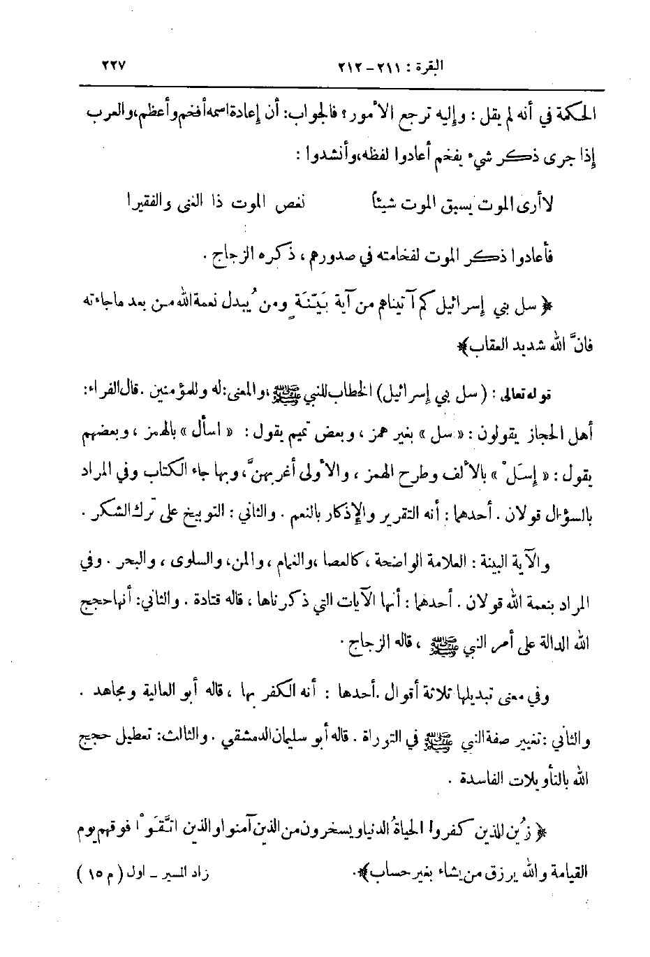 قوله تعالى سل بني اسرائيل الخطاب للنبي صلى الله عليه و سلم والمعنى له وللمؤمنين قال الفراء أهل الحجاز يقولون سل بغير همز وبعض تميم يقول اسأل بالهمز وبعضهم يقول إسل بالألف وطرح الهمز والأولى أغربهن وبها جاء الكتاب وفي المراد بالسؤال قولان أحدهما أنه التقرير والإذكار بالنعم والثاني التوبيخ على ترك الشكر