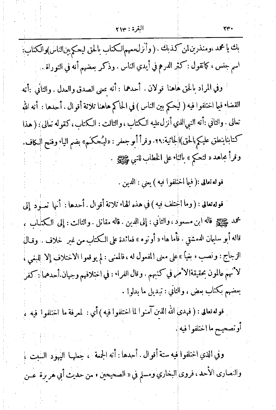 وفي المراد بالحق ههنا قولان أحدهما أنه بمعنى الصدق والعدل والثاني أنه القضاء فيما اختلفوا فيه ليحكم بين الناس في الحاكم هاهنا ثلاثة أقوال أحدها أنه الله تعالى والثاني أنه النبي الذي انزل عليه الكتاب و الثالث الكتاب كقوله تعالى هذا كتابنا ينطق عليكم بالحق الجاثية 29 وقرأ أبو جعفر ليحكم بضم الياء وفتح الكاف وقرا مجاهد لتحكم بالتاء على الخطاب للنبي صلى الله عليه و سلم